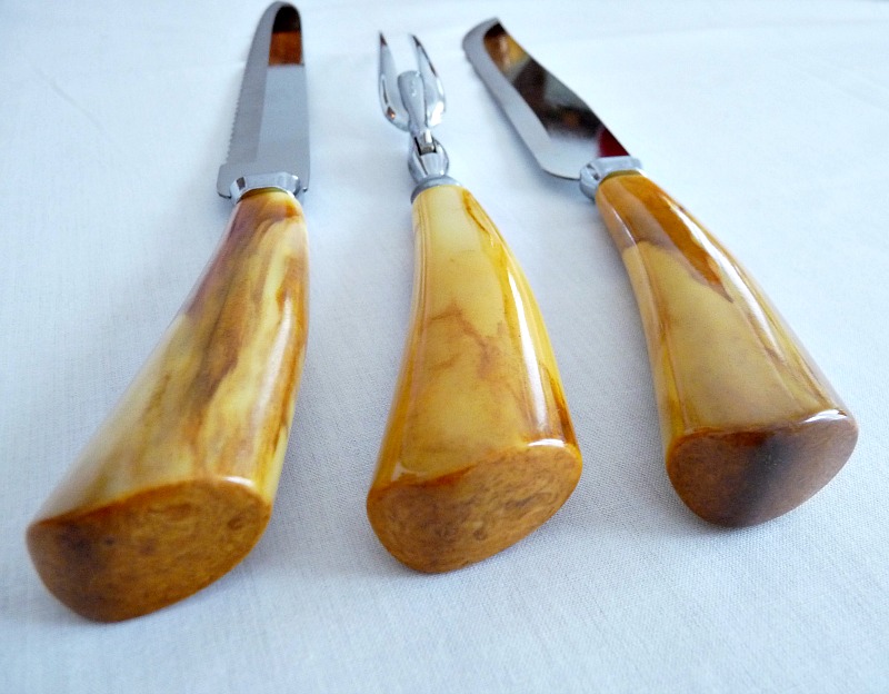 They don’t match, but happen to look nice with a few pieces, also with bakelite handles, that I bought at a yard sale in Thunder Bay.  The difference is the yard sale pieces were $1.00 each.  The carving set, from Value Village, was $19.99!  Ouch.  But it obviously brings me too much joy to have passed on.