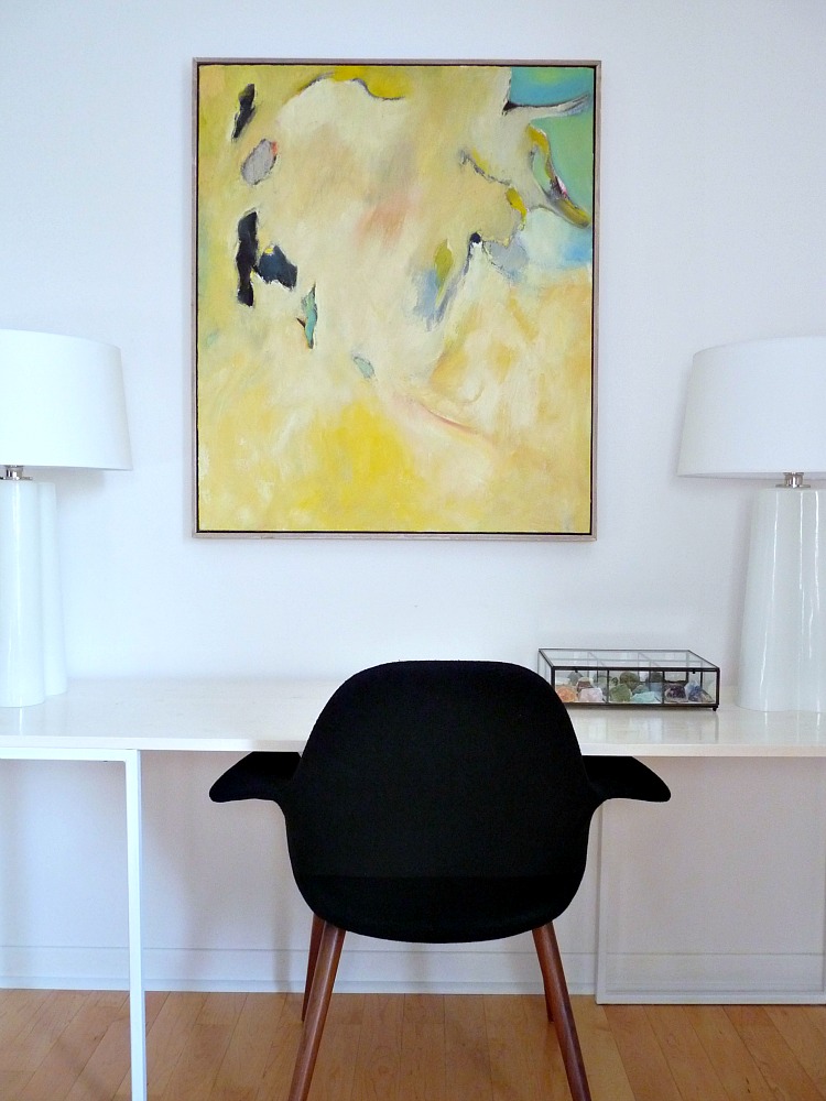 I haven’t had a lot of time for DIYs, other than gluing things to other things (felt to tiles, pennies to rings), because I’ve been spending my time running around the townhouse with art, yelling “HOW ABOUT HERE?”. When the dining room painting was swapped out for another, my favorite oil painting needed a new wall. I knew right away the office wanted to give it a home. For those who thought, “yawn to the cream pillows,” here’s the dash of colour the office always wanted.