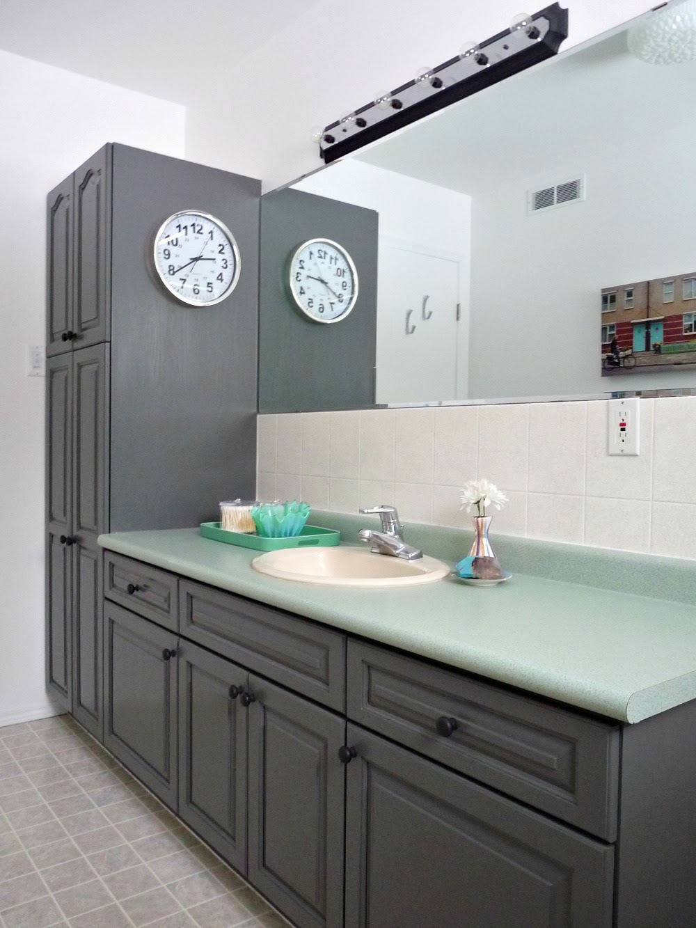 Thanks! I used Rustoleum's cabinet transformations kit, in "Castle". Here's the link to how I refinished the cabinets:http://dans-le-townhouse.blogspot.ca/2013/11/refinishing-bathroom-cabinets.htmlThe kit made it easy because there was no sanding (a de-glosser is included). If you're thinking of using your own brand of paint, you can likely colour match it.