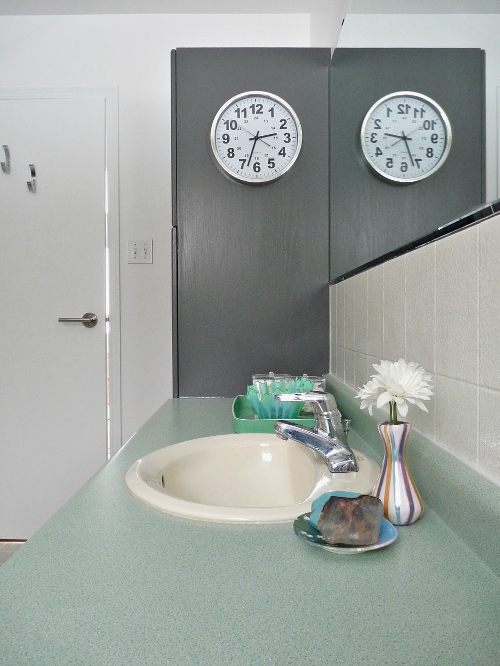 Thanks! The clock has been the only bathroom accessory that has followed me from our apartment bathroom, to our first home (and townhouse) to here.