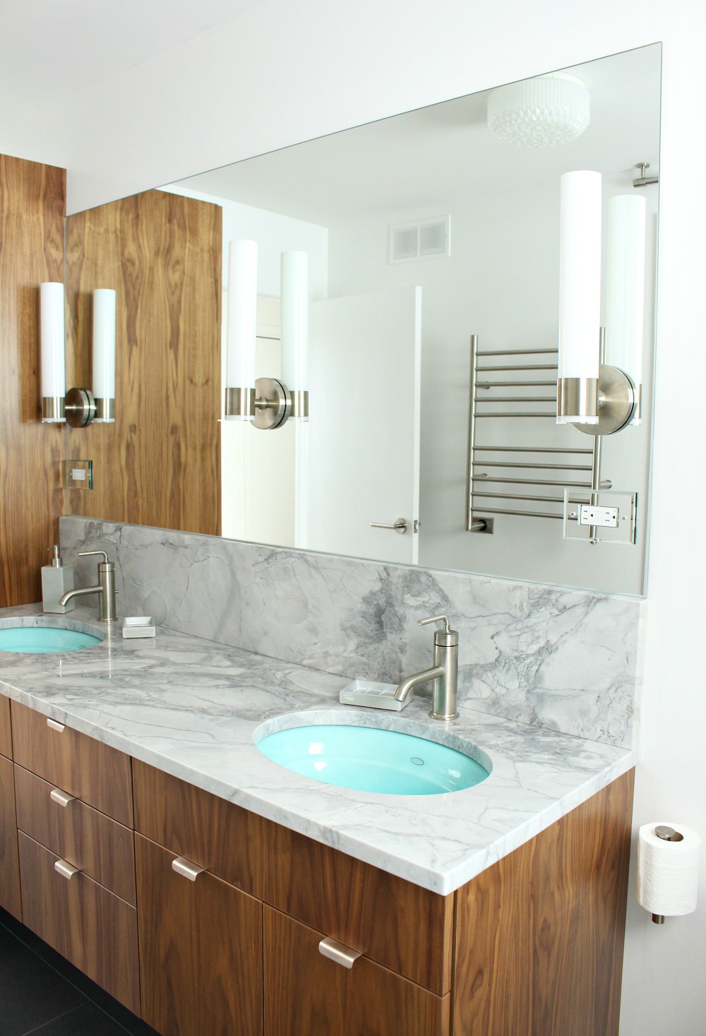 The best place to start designing a bathroom – or any room – is Pinterest! I created a special board for Bathroom Design Inspiration and that’s where I started collecting photos of any bath designs I liked. Now I’ve turned it into a resource for others, but in its early stages I also pinned anything I liked – a color, art inspiration, walnut furniture – anything that I really, really liked. Once the board started getting full, I looked back through my pins and started teasing out themes and commonalities. From there it was clear that there were some must-haves: a pop of aqua, walnut cabinetry, stone counters. Having a clear vision in mind kept me from getting distracted when other options (like the acrylic cabinetry) tried to derail me!