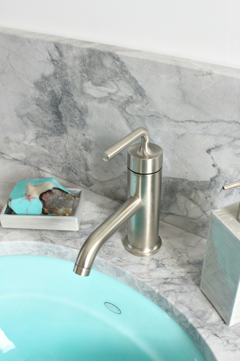 Colorful sinks are an unusual choice – and a commitment! – so I don’t advocate a bold sink for everyone (although I have to show you this grey Kohler sink – isn’t the color gorgeous?). The point is to find out what element in a room really makes you smile and make it happen. It might be a bold tiled backsplash or a quietly stunning slab of marble. It doesn’t have to be bold, but once the main attractions of a bathroom design are chosen, it’s important to give them some room to shine by choosing some more neutral finishes or fixtures.