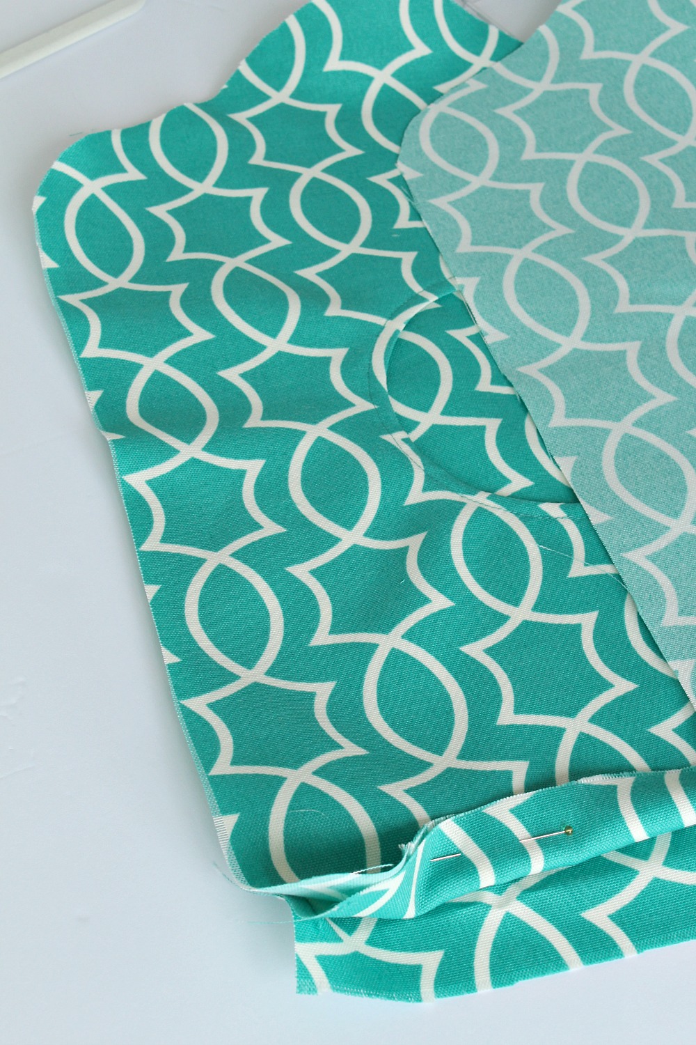 Pin the top layer of the fabric out of the way, and sew together the bottom layer and the additional piece, leaving a small opening at the very top for the hanger to poke out: