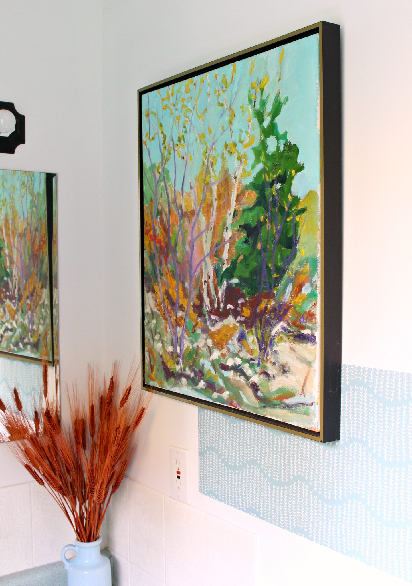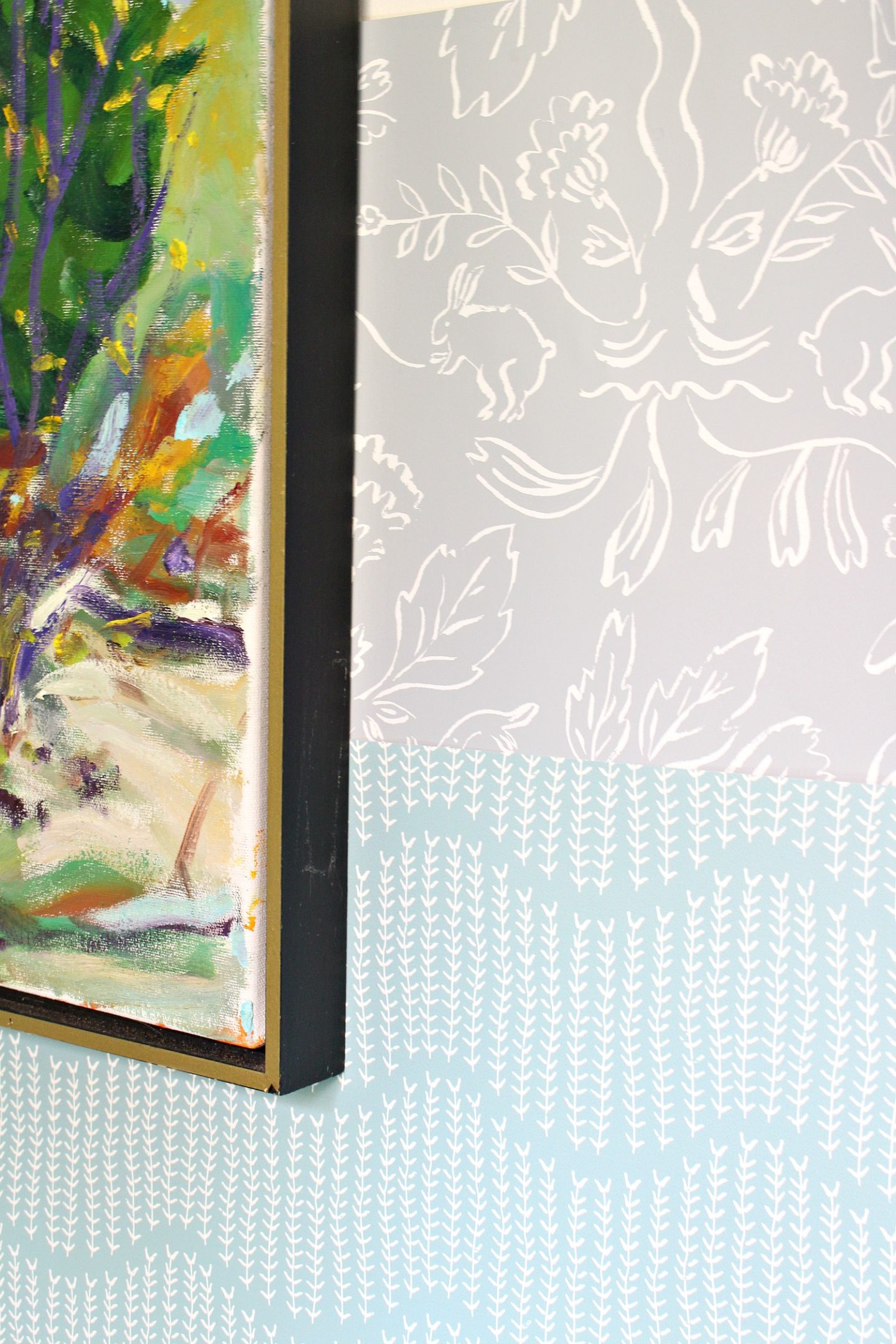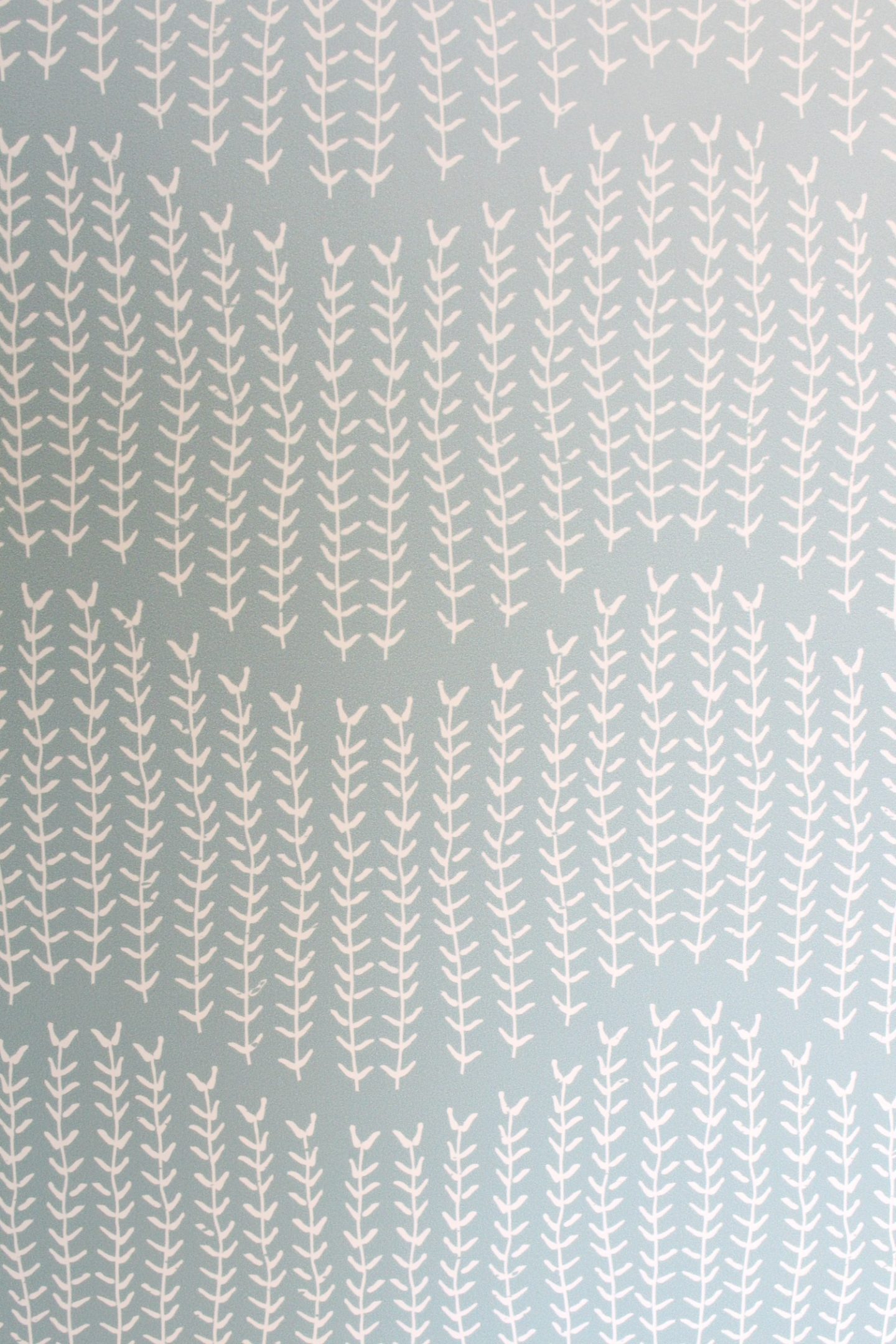 It features white sprigs on a grey/green backdrop, which just happens to be almost the exact same shade I painted the new window walls in the bedrooms and main bathroom – it’s also the same color as the bathroom shower curtain and pops up a lot in the decor and artwork. I like that it is keeping with my whole home color palette and also with the natural/woodland vibe I’m going for in this powder room. But from a distance, the sprigs form a wave, which has a coastal vibe I also love.