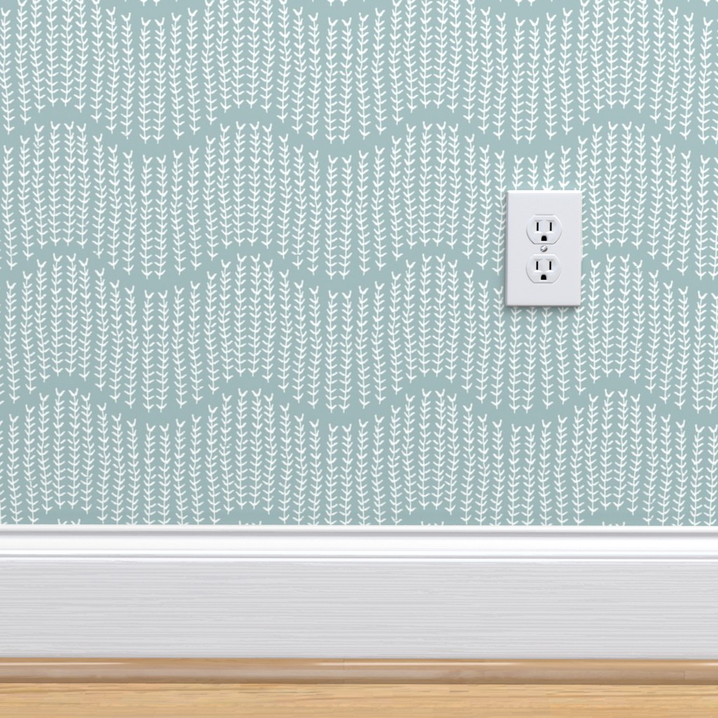 But I also really liked this Storyline wallpaper, but it is definitely grey – no hint of green of color, it’s a very pure grey. But I love the quirky design because it reminds me of something Hubby’s grandpa might have drawn. It’s whimsical and woodsy, but when I got our custom blinds for all four windows on this side of the house, I chose a grey/green that I worry will not pair well with this wallpaper. The sprigs wallpaper, on the other hand, works well with the blinds…