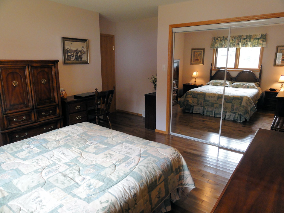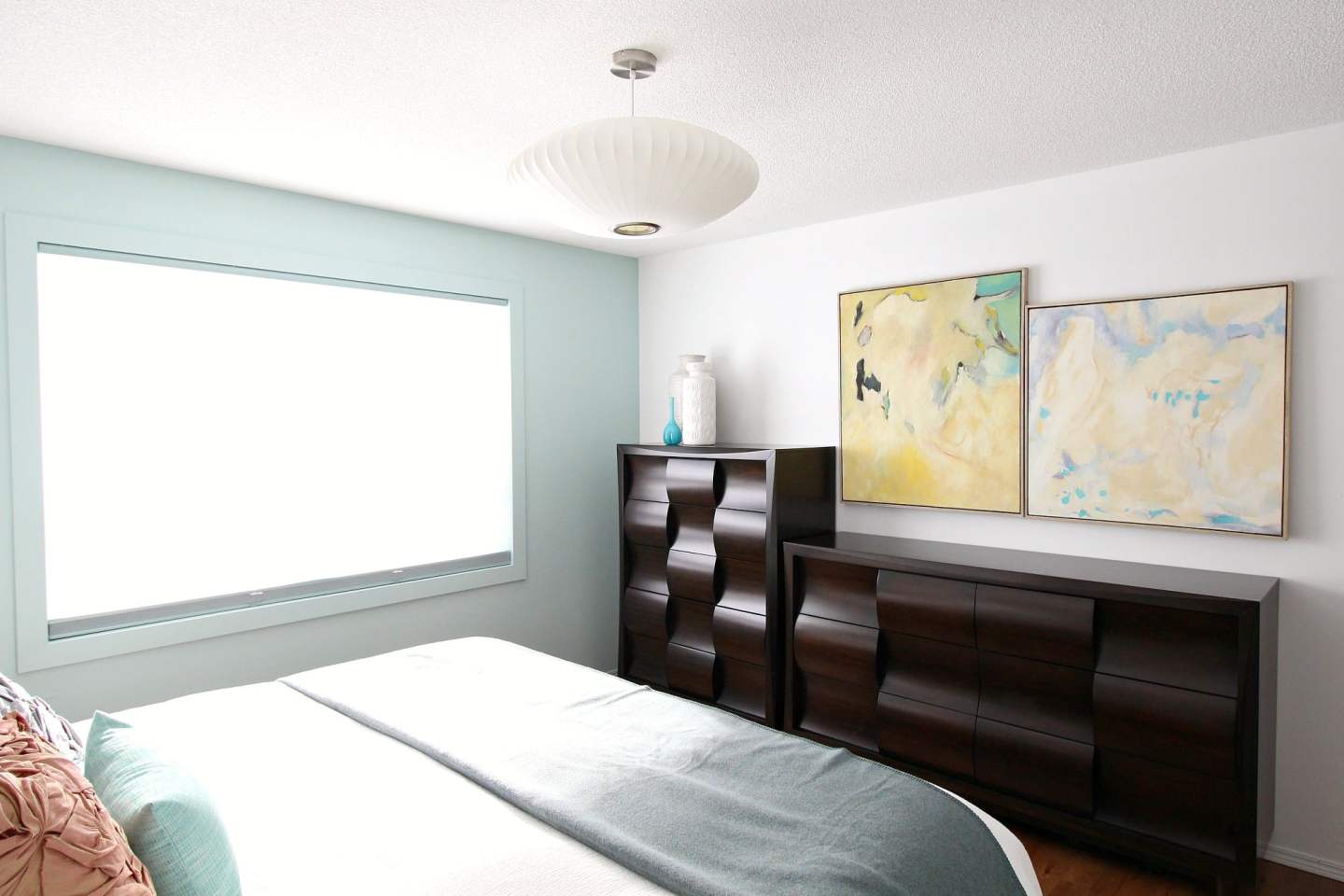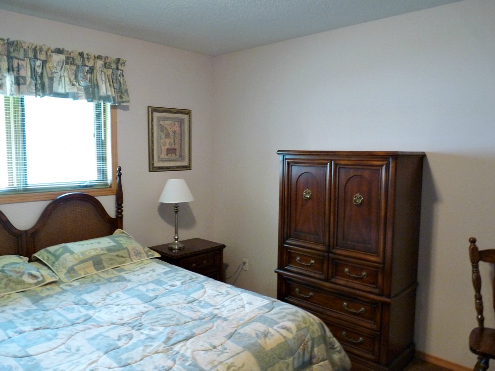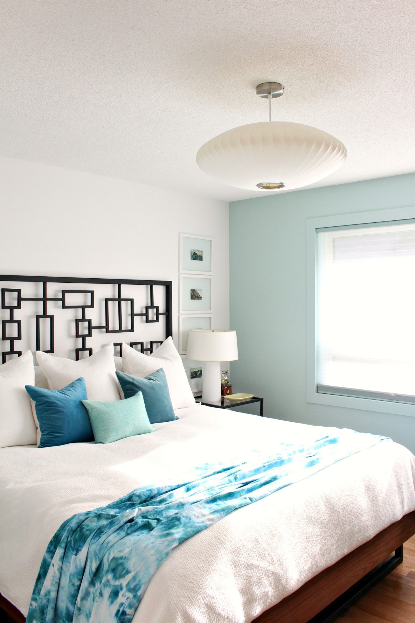 By 2019, we had replaced the windows throughout the house, so the bedroom now had a stunning new window. The old curtain rod – and DIY back tab drapes – no longer fit. After the window wall was patched, I couldn’t get the same white paint and, with no energy to repaint the entire room, I just painted the window wall a soft green. We splurged on new custom blinds and installed a bubble light I had thrifted for $20. I also replaced my DIY art with framed antique post cards featuring Lake Superior (displaced from the living room after we built the TV bump out and installed the new speakers).
