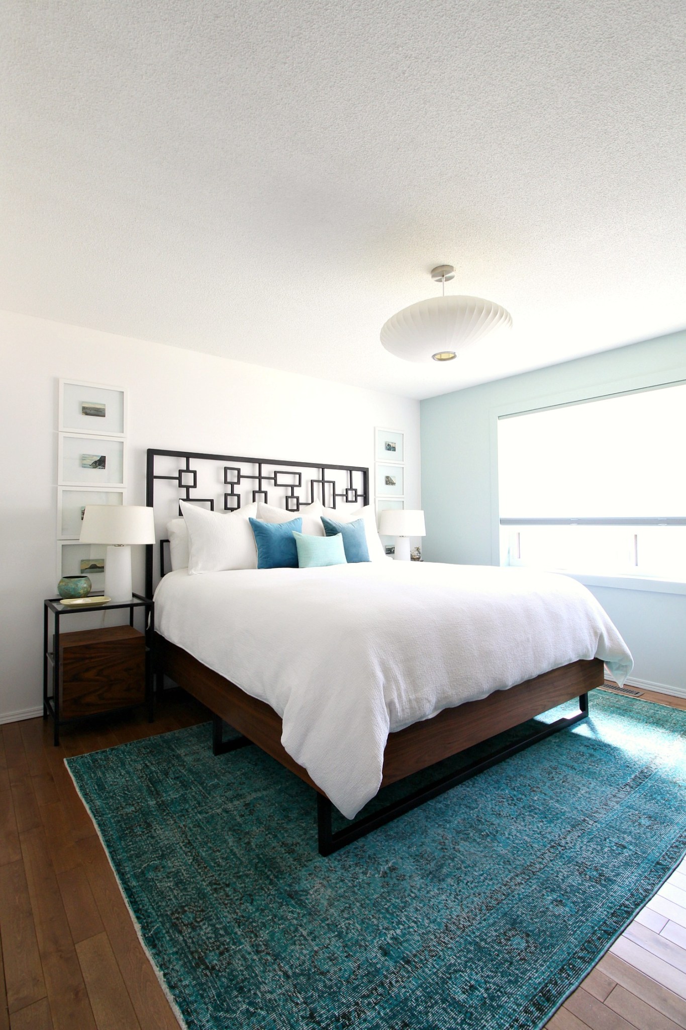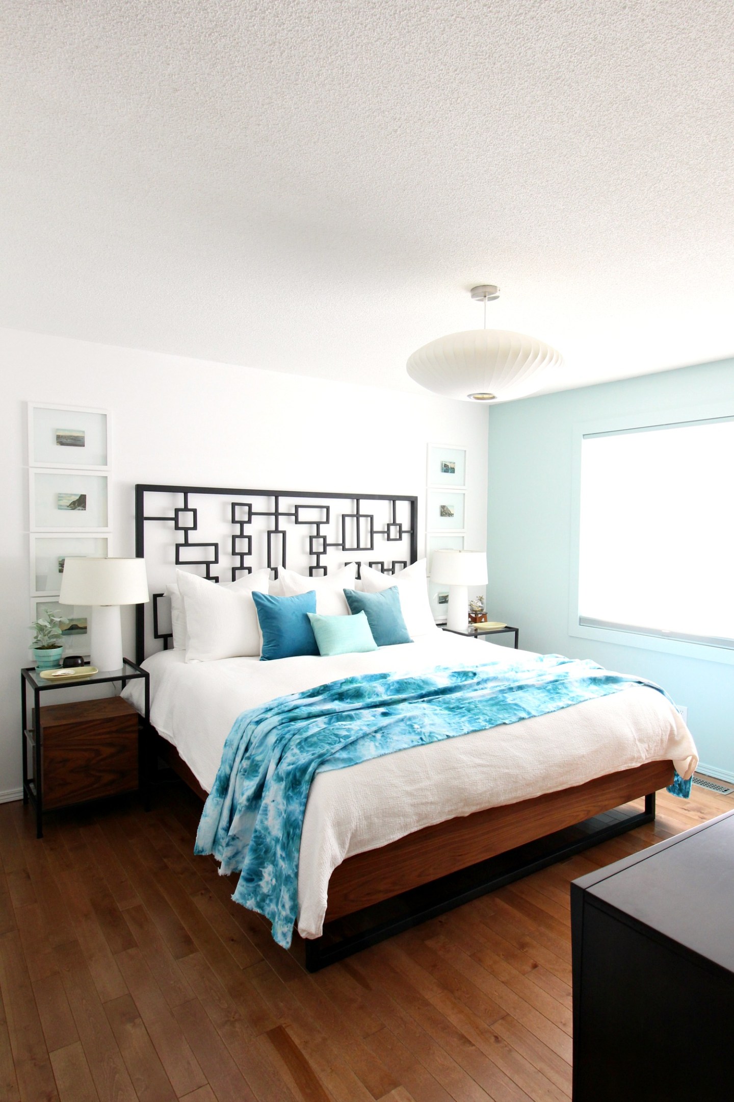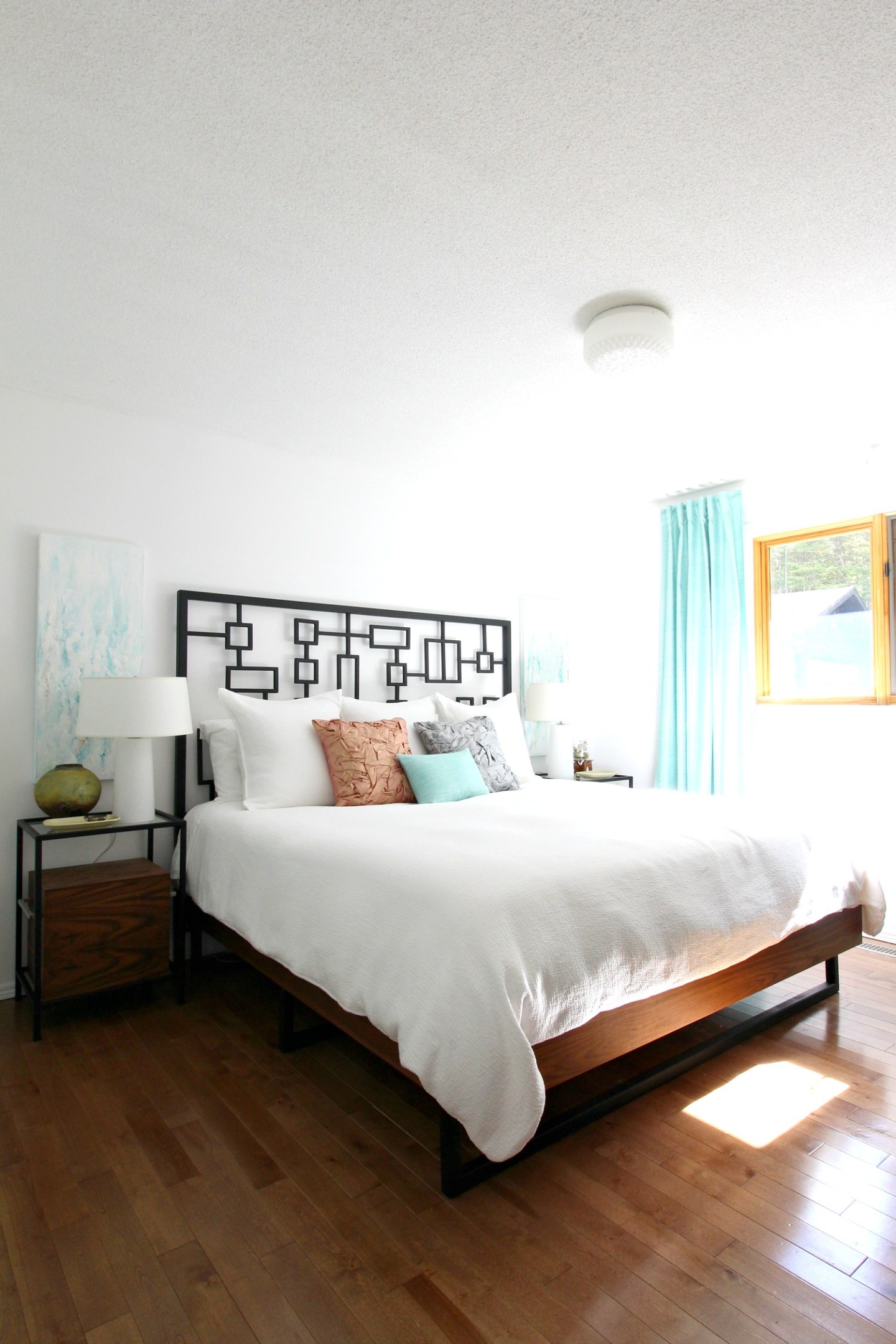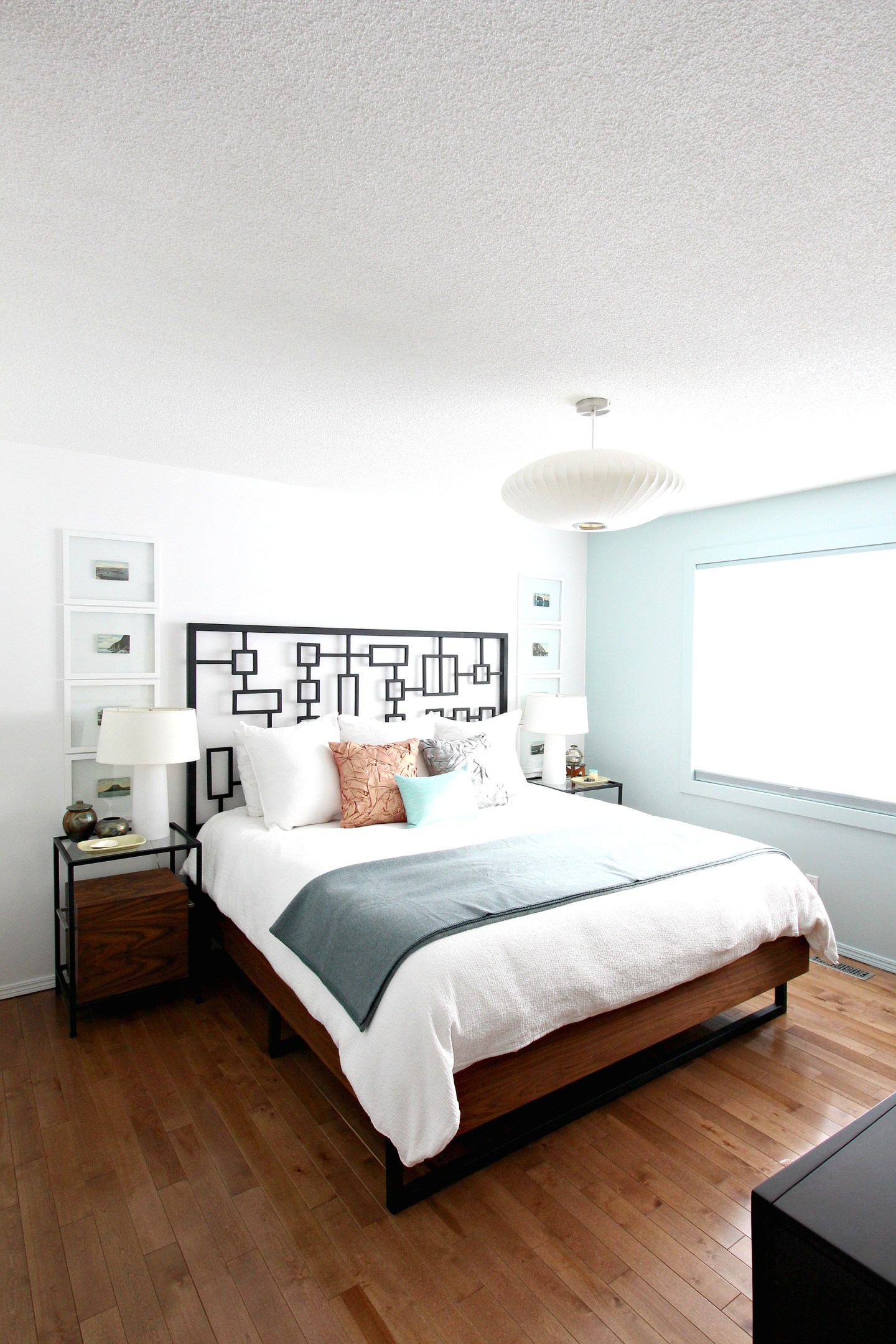 Two year after the mini makeover, I was still loving the look but really tired of the bed skirt. Szuka loved leaning against it, so it had a permanent dent and just collected dust and (her) butt fluff. So we built a new walnut bed frame to match the welded headboard. I really leaned into the mid-century vibe with this new bed. I also upgraded our duvet cover and shams (same theme: white and textured), and splurged on a new wool throw. I was craving more layered textures and loved the combo of the tweed, textured bedding, wool throw, silk pillows…