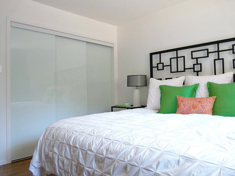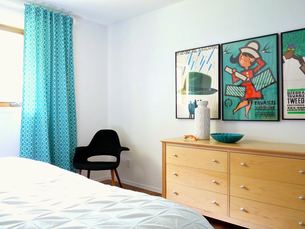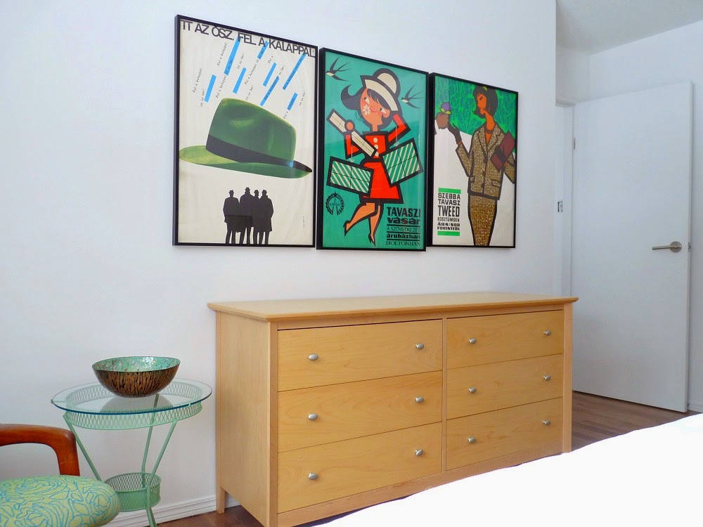 When we moved in, the first thing we did was paint the walls and trim white. Then we simply filled the bedroom with furniture we had from our former townhouse – with the addition of a dresser from my Mom (a placeholder until we found a pair we liked). Although we already owned everything, it felt new to us because some things had shuffled from where they had lived in our former townhouse. The chair, a vintage find I had recovered, and the table, a vintage piece my grandma gave me, had both lived in the guest room in the townhouse. The vintage poster art, which I had brought back from Hungary, had lived in the kitchen.