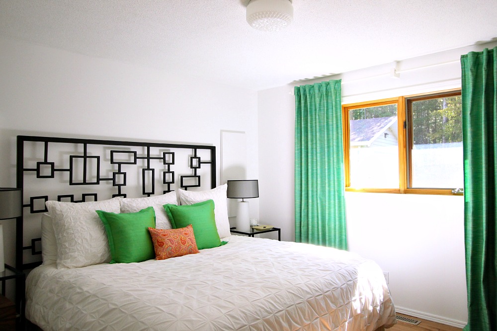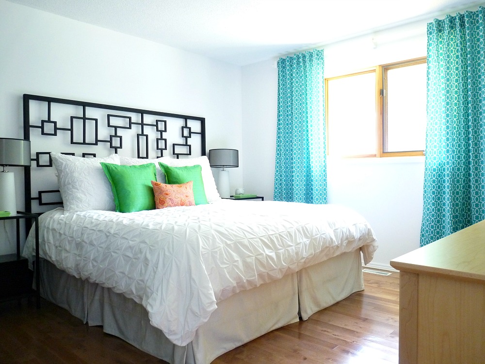 Even though the bedroom design has changed over the years, I was careful not to be too wasteful about it. I spent a lot of time shopping my house and tweaking what we had, carefully finding new homes for things that no longer worked. The vintage green chair has pride of place in the living room now. The green tweed drapes, green silk pillows, poster art, black mcm chair, and vintage metal table moved to my Mom’s. The placeholder dresser now offers guests storage in the bunkie. Even my old white duvet cover and bed frame are being used by a relative. I sold the original teal drapes and espresso dressers. Only the turquoise tweed drapes, ice dyed throws, and framed poster art remain in storage – but they will see the light of day again.