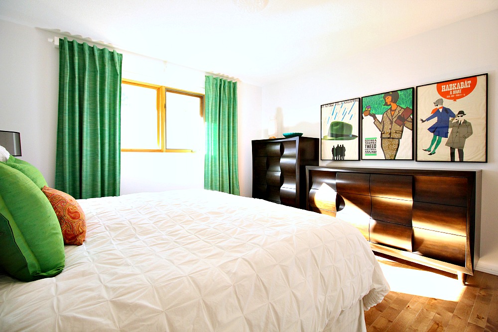In 2015, I switched up the poster art: I sold the middle poster and purchased a different one I had liked while we were in Hungary. I hadn’t planned on hanging all three together when I first bought them, but I loved the scale of three together, so I finally bought one that looked better in that arrangement. This switch made me happy but, of course, the printed teal curtains no longer worked! I moved them to the office, but eventually sold them. Unable to find the perfect fabric locally, I finally ordered some fabric samples online and bought bold green tweed fabric for new DIY back tab curtains. This time, I seriously considered white tweed, but the shade of green was TOO perfect – it was an exact match. So I went with a bold color again. At this time, I partnered with a furniture company so I finally got new dressers! They were supposed to be grey stained cherry, but ended up being a very dark espresso.