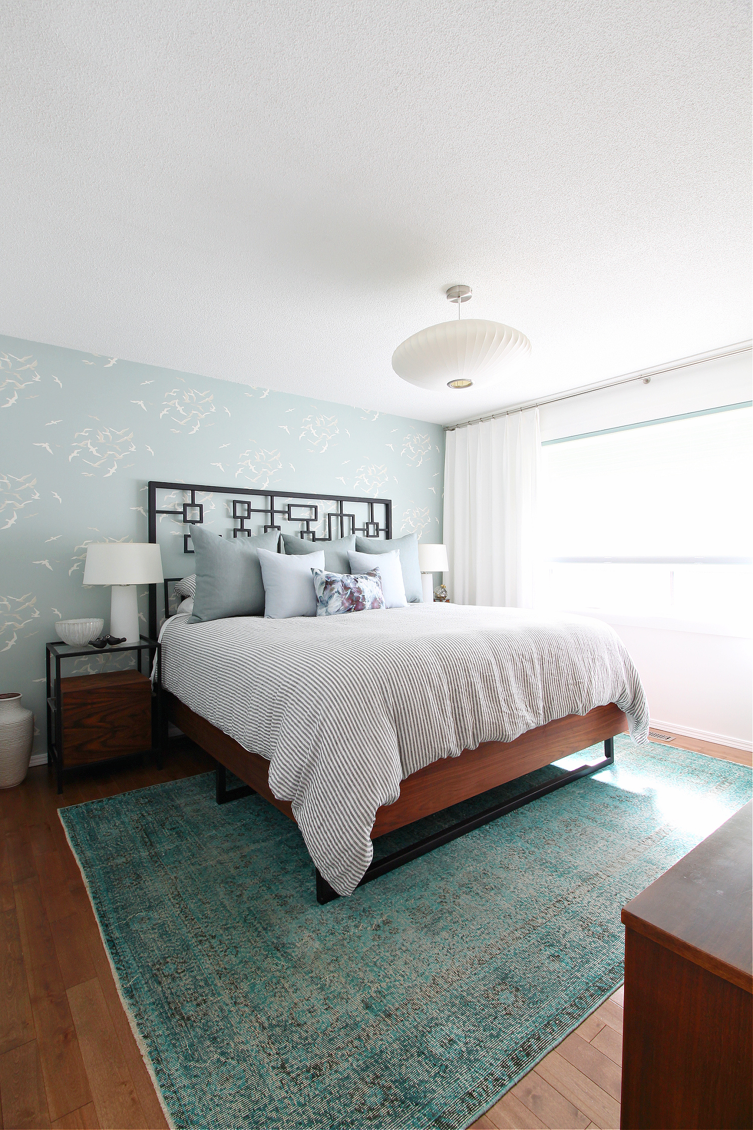 Emboldened by the teal overdyed rug, and how much I loved it in the bedroom, I plotted a new makeover, featuring a bold, “tie dyed” mural, coastal striped linen bedding and white linen drapes. I had a really “coastal meets mcm” vibe in my head. At first I really like it, but the mural, while gorgeous, ultimately overwhelmed the small space and a mismatch of one of the seams eventually drove me bonkers.