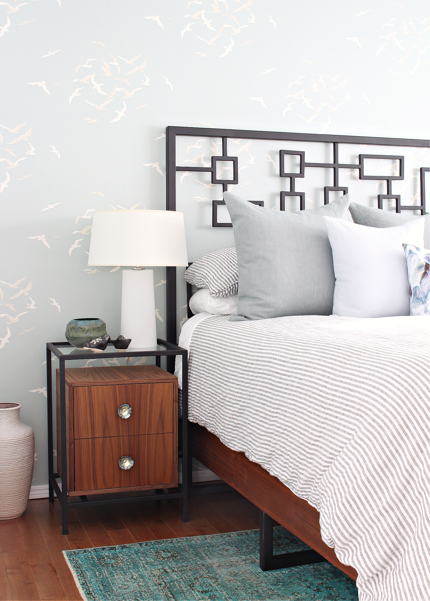 Six months later, I removed the mural and installed a softer, more elegant wallpaper. With a soft, beach glass colored background and stylized seagulls, this wallpaper set the tone for the latest bedroom makeover: soft, airy, coastal – and more sophisticated. I loved the wallpaper with the existing elements: the overdyed rug, the striped linen bedding, the DIY bed, and the artwork by Hubby’s grandpa. But the pale green wall competed with the wallpaper, so I finally re-painted it white. I splurged on a custom curtain rod and my Mom and I sewed luxurious, wall to wall linen drapes with a Euro pleat. Finally – white curtains! We also sewed new linen throw pillows – including Euro shams! After years of buying matching duvet covers and shams, 2021 was the year I decided to mix and match my bedding, for a more laid back look.