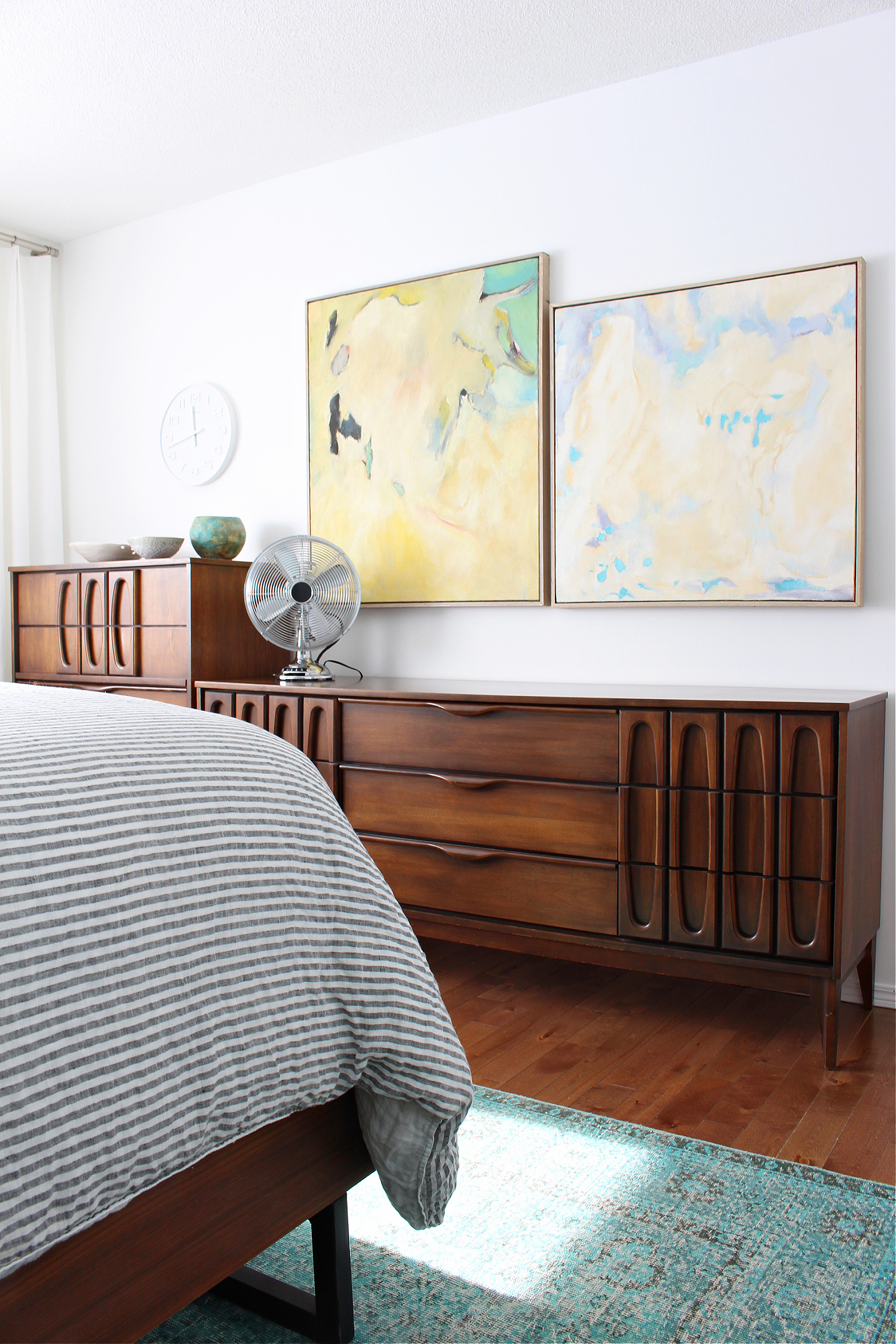In 2018, the bedroom received an unexpected mini refresh again! Unfortunately, Hubby’s grandpa passed away this year. We inherited 5 new pieces of his artwork and, with a very small space and limited walls, my vintage poster art was given to my Mom to make room for the new paintings we brought home. We decided to hang a new painting above the dressers, beside one we already owned (that had lived elsewhere in the house). The new piece we chose was ethereal and light, so the bold, MCM vibe of the bedroom gave way to a more peaceful, muted pastel aesthetic. I moved turquoise tweed curtains we had sewn for the office into the bedroom, and softened the art I had made for either side of the bed. Hanging another new painting in the dining also meant I had to get smaller lamp shades for the credenza lamps, so I used the larger shades in here – I was so tired of dusting the formerly black lamp shades, anyway! My Mom and I sewed new gathered silk pillows, using leftover silk from my wedding dress and framed Hungarian embroidery, to complete the softer look.