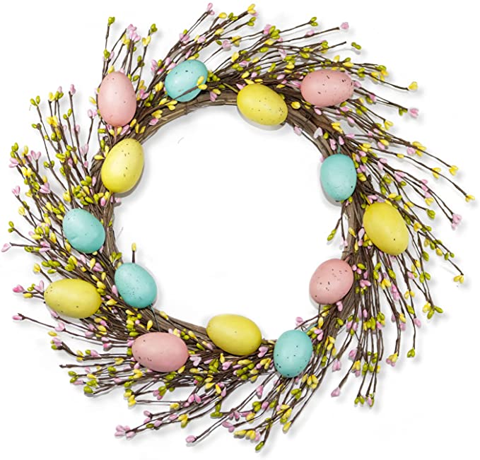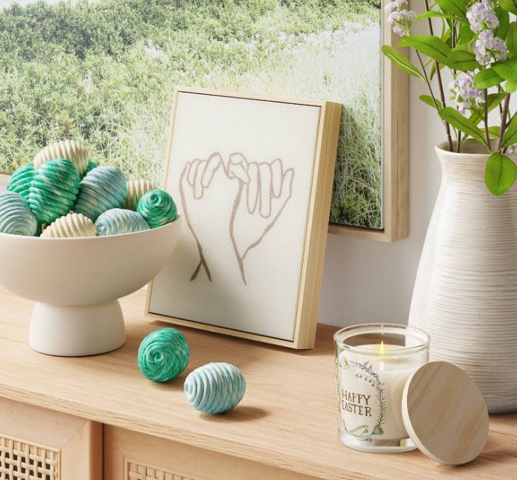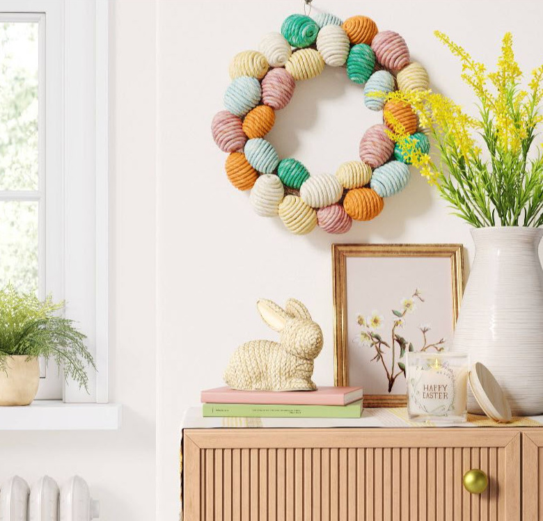 Speaking of egg wreaths, I also love this more textural egg wreath – could be an easy DIY, too. They’ve made of foam and corn husk, but I think thick yarn would create a similar look. You can also just buy the loose eggs as filler for a bowl or vase – they’re sold in two color ways (the cool aquas or warm oranges). And these ceramic ones are gorgeous too.