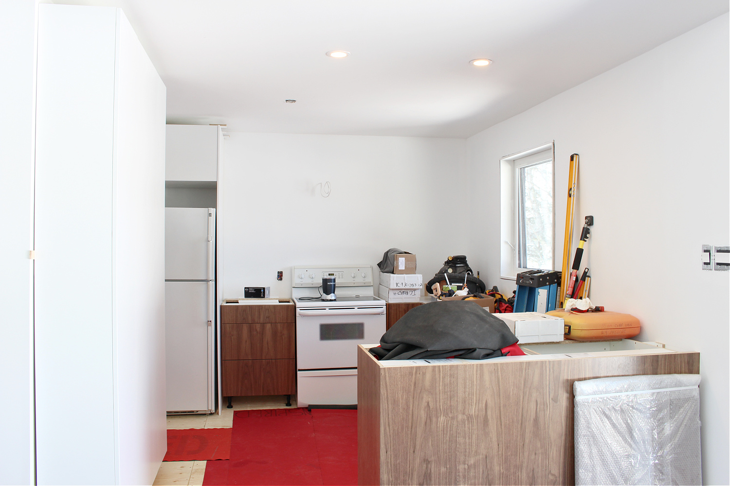 I have to admit, I’m a little nervous! It’s so weird to see the kitchen looking so different! I am loving all of the storage, for sure – and being inside the kitchen is so spacious now. Hubby and I will no longer bump into each other, lol. So there’s so much I love about it already: the huge pantry, the additional cabinets, the beautiful walnut grain. However, to be totally, 100% honest, there are already a couple of teeny things I wish I’d done differently, and a couple of things I hope they can fix, but also it just still looks so rough right now, so maybe once it’s finished some little details won’t bother me after all. I’m not sure when the cabinets will be done, but I’m sharing daily updates in my Instagram stories!