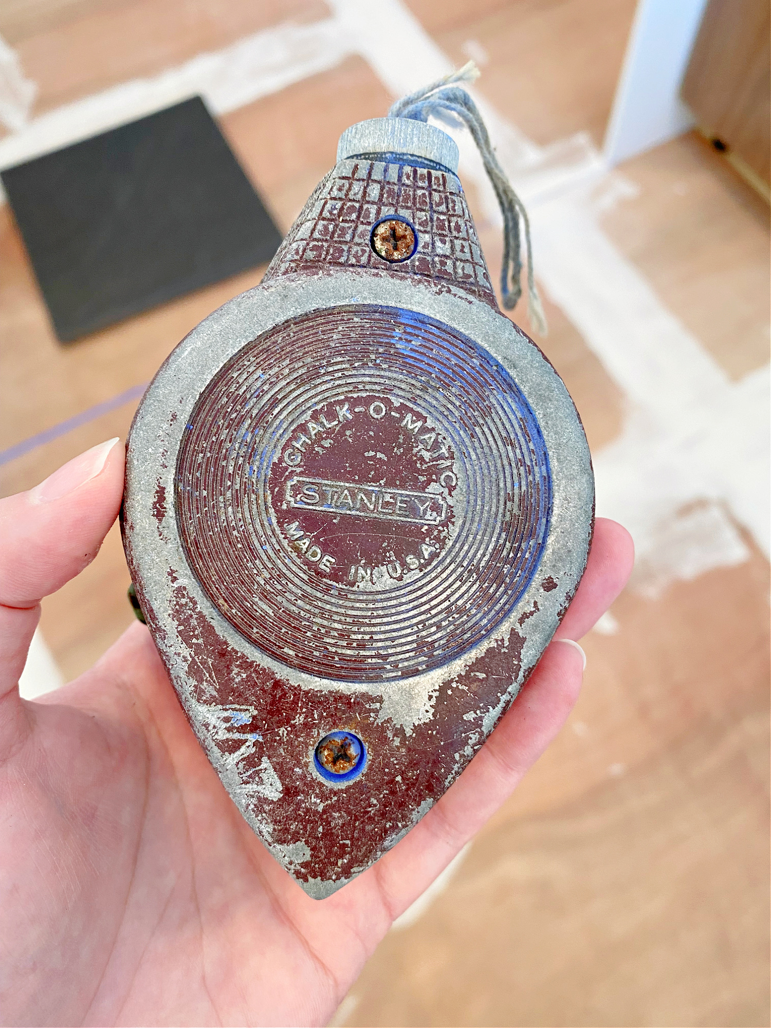 We found this antique chalk line with the house, and I don’t know why we still use it because it’s absolutely terrible! It spits out SO much chalk. For the second line we just used a pencil, our framing square, and a longer straight edge (we used a level). I recommend buying a functioning chalk line.