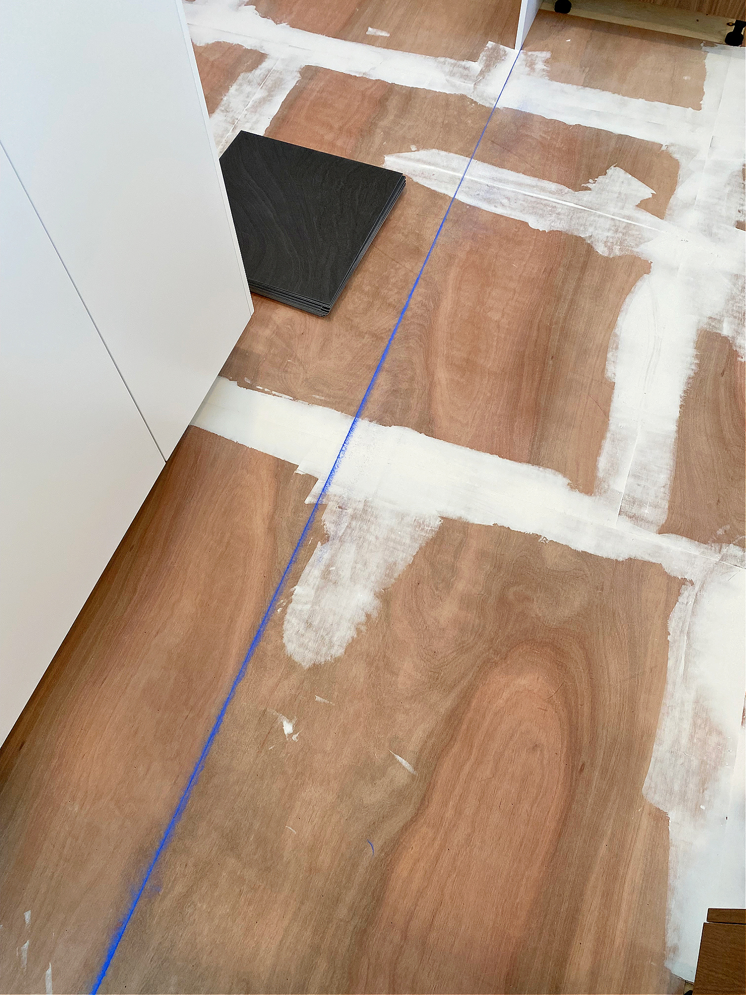 The instructions for the flooring suggested we mark chalk lines on the floor, marking off the center point of the room and installing the flooring outward from there. That was a little bit of an issue for this space, for three reasons: