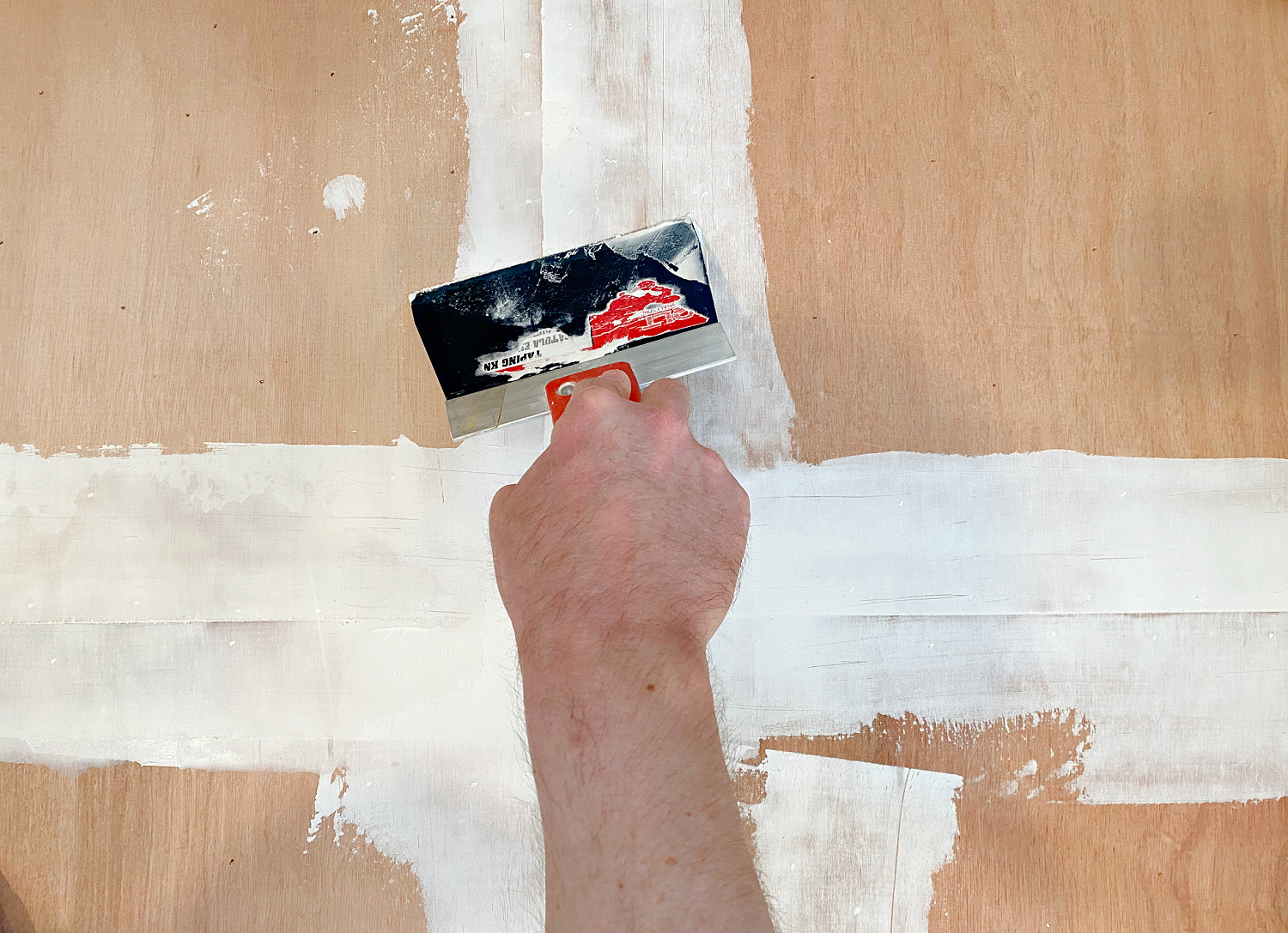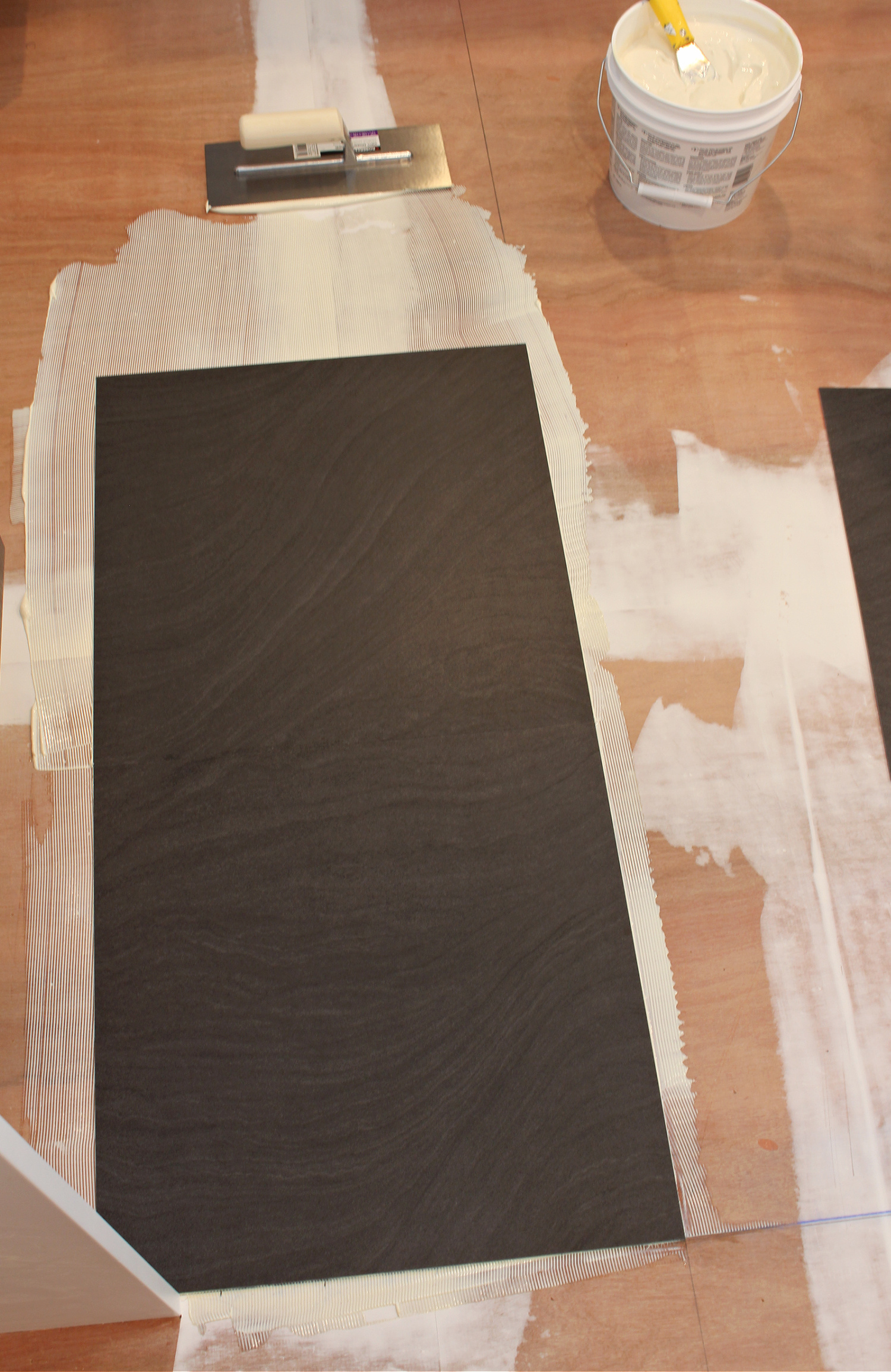 To glue down these tiles, we worked in small sections and applied a dollop of glue to the plywood underlayment, using a small putty knife to just scoop it out of the bucket.