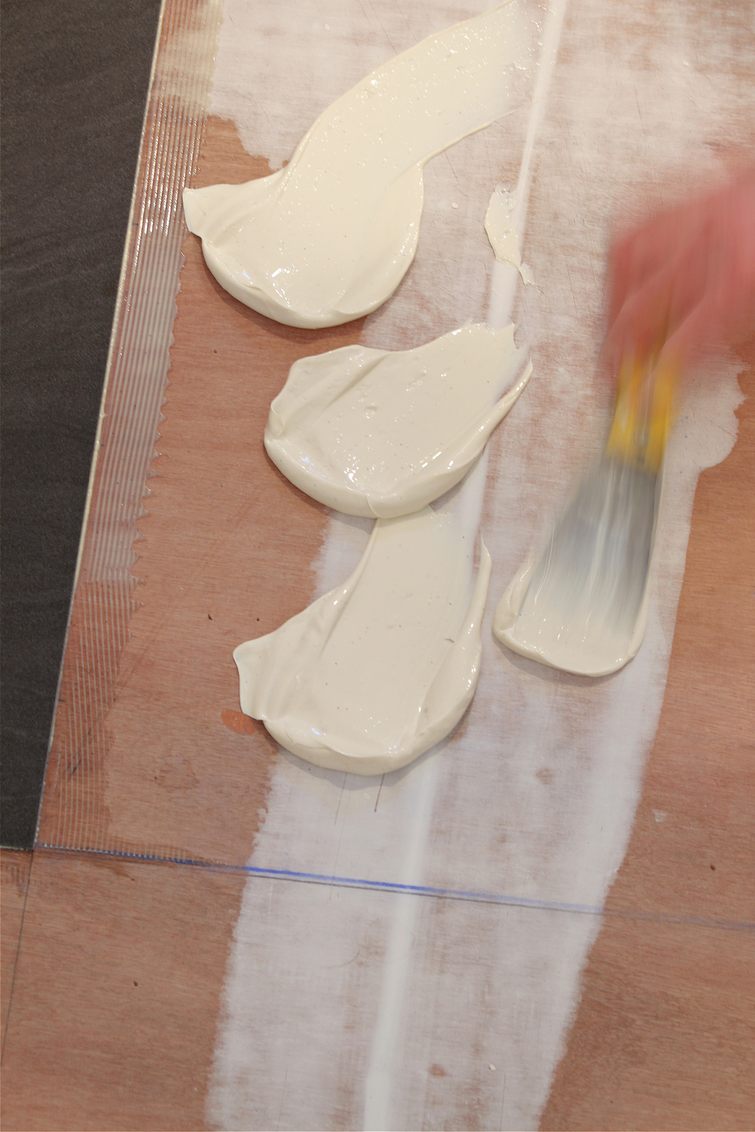 We scraped the glue down to a thin layer using the U-notch trowel, held at a 45 degree angle.