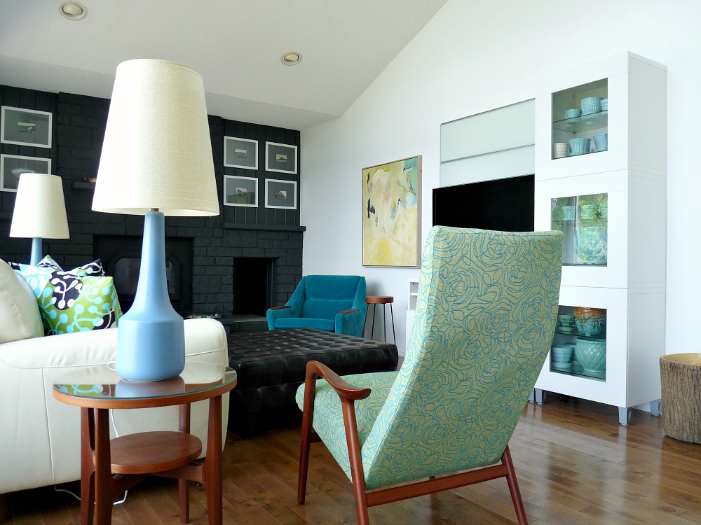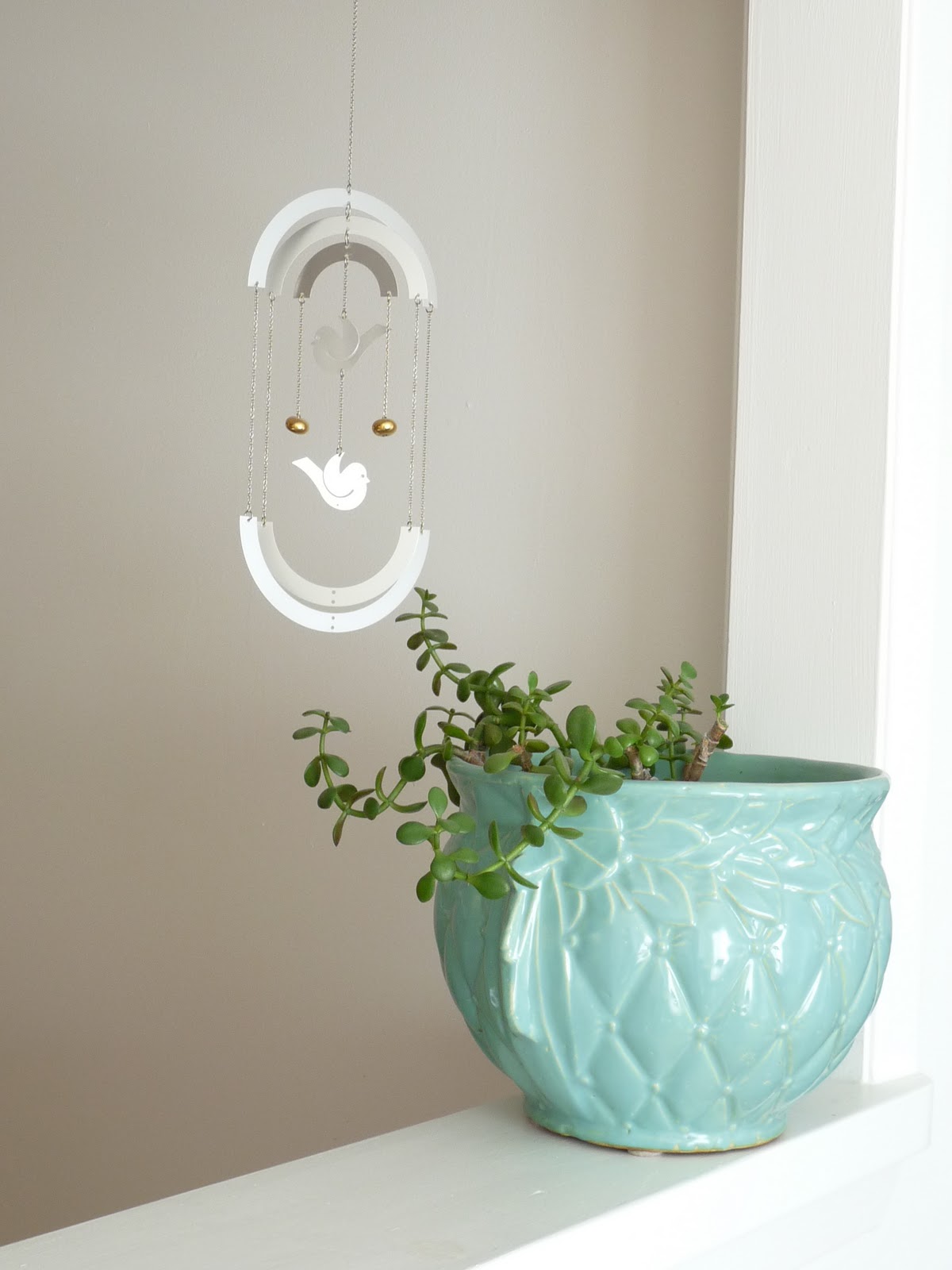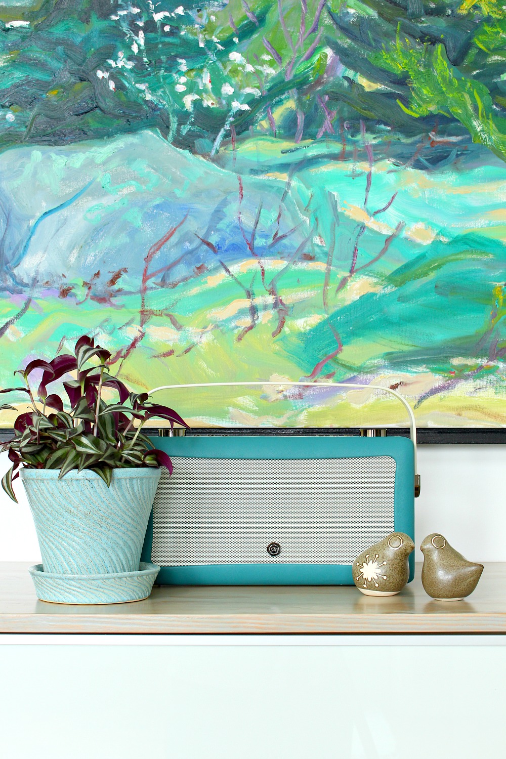 I also used some of my turquoise McCoy pottery planters to create little spring and summer mantelscapes at my Mom’s: