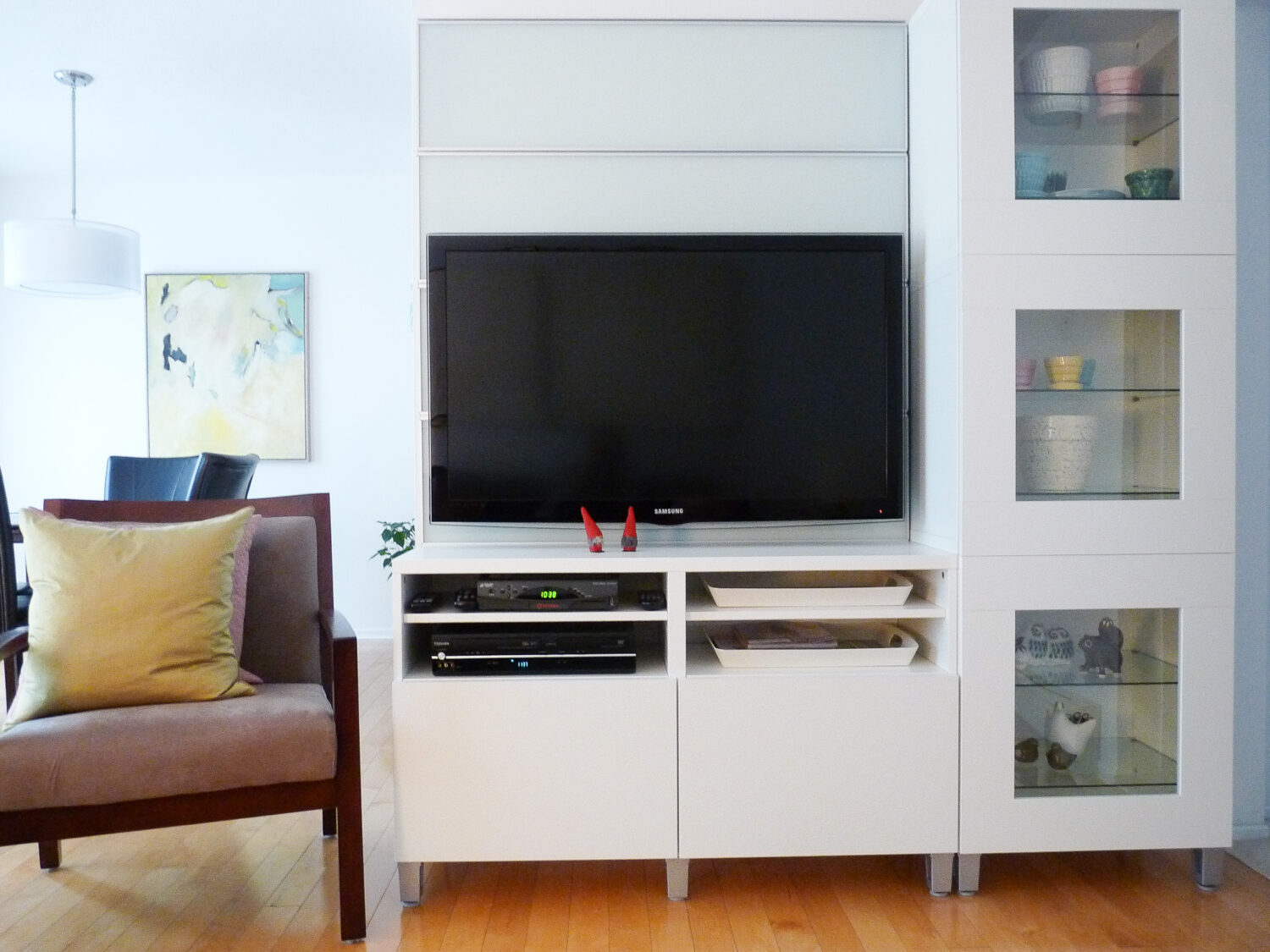 I mostly collect planters, and I started collecting turquoise, green, pink, cream, and yellow. Eventually, I only collected turquoise. As you saw above, my McCoy pottery planter collection started very small, but once I had this IKEA Besta cabinet for display I started to get more excited about collecting McCoy pottery. Having a place for collections always makes it more fun to find pieces and I loved the Besta cabinet because it had sturdy glass shelves and nice glass doors, so the pottery was secure but very visible!