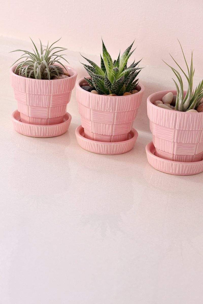 But eventually my mini collection of pink basketweave McCoy Planters went to live at my Mom’s, after we gave her kitchen a pink and grey kitchen makeover!