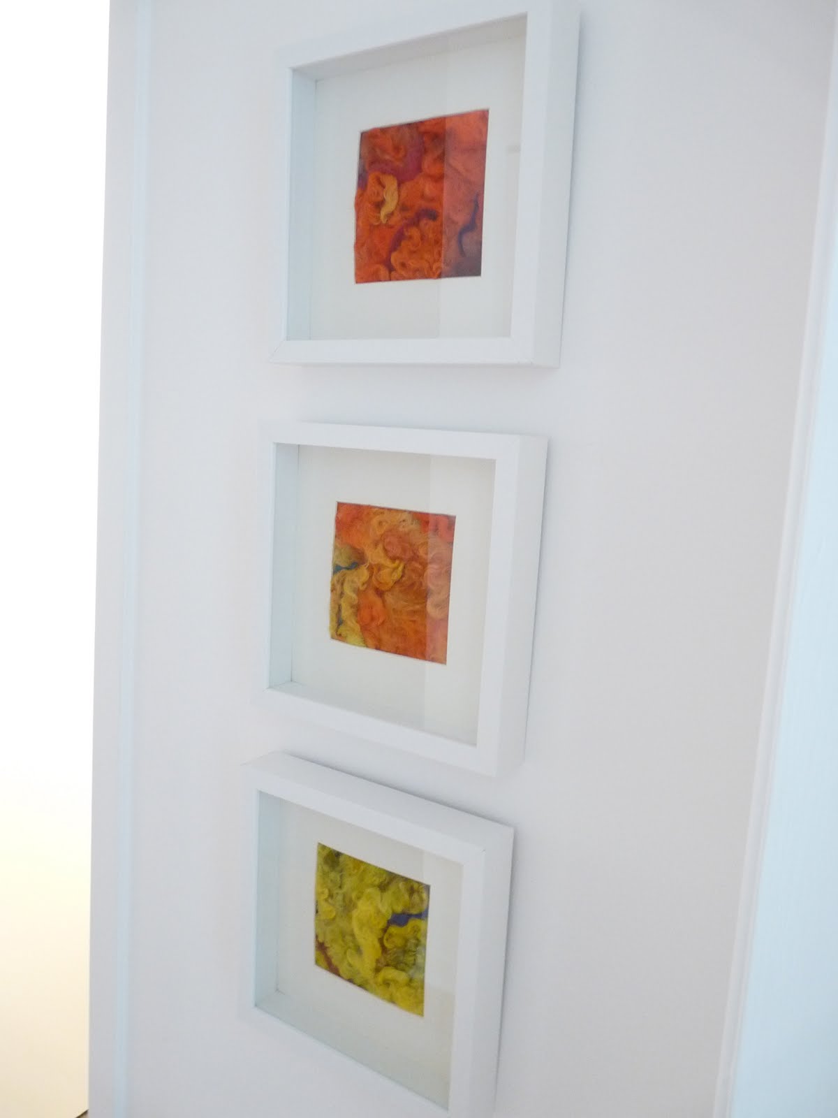 I love easy wool crafts! My most recent project is this trio of easy, needle felted abstracts. It’s hard to capture on camera, but the abstracts are three-dimensional, with a sculptural feel.