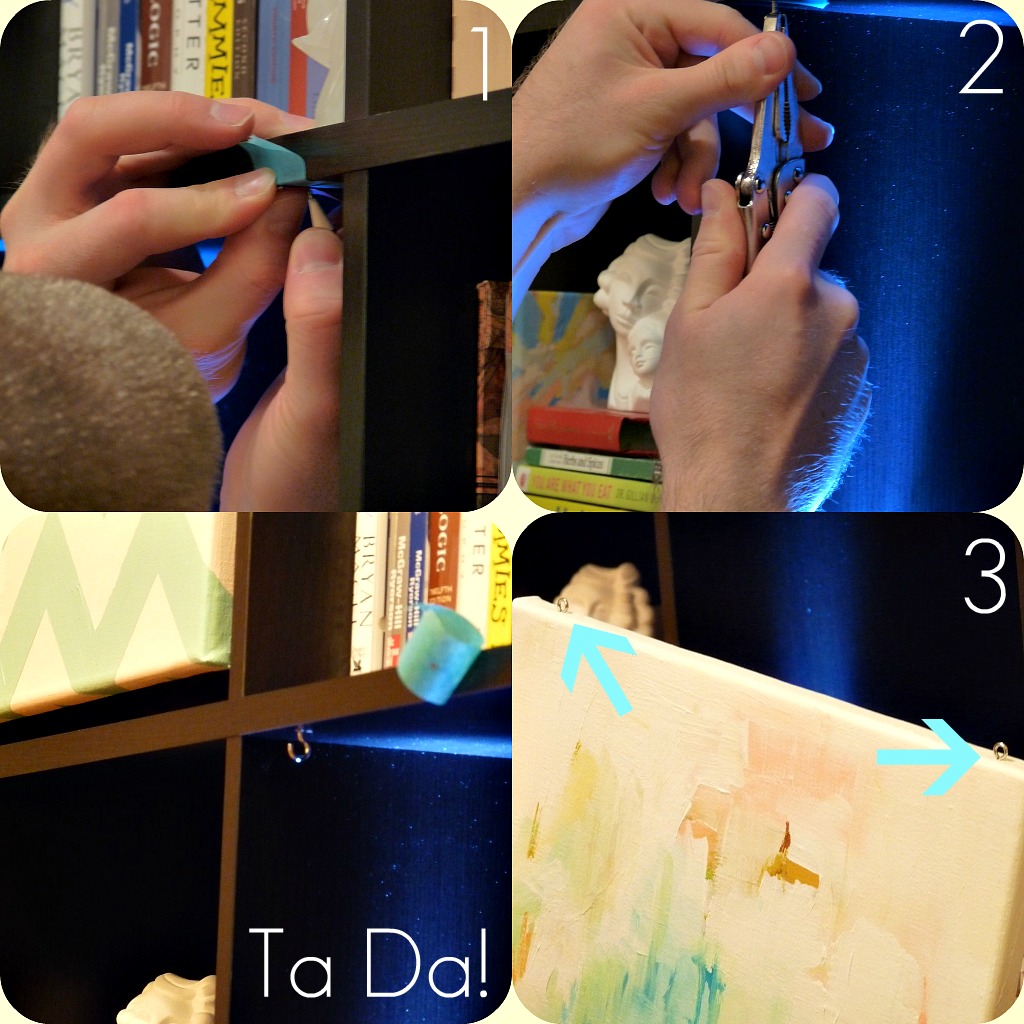 This looks amazing! How lucky that the canvases with the hooks hang perfectly centered!! Love your paintings too! Great idea!