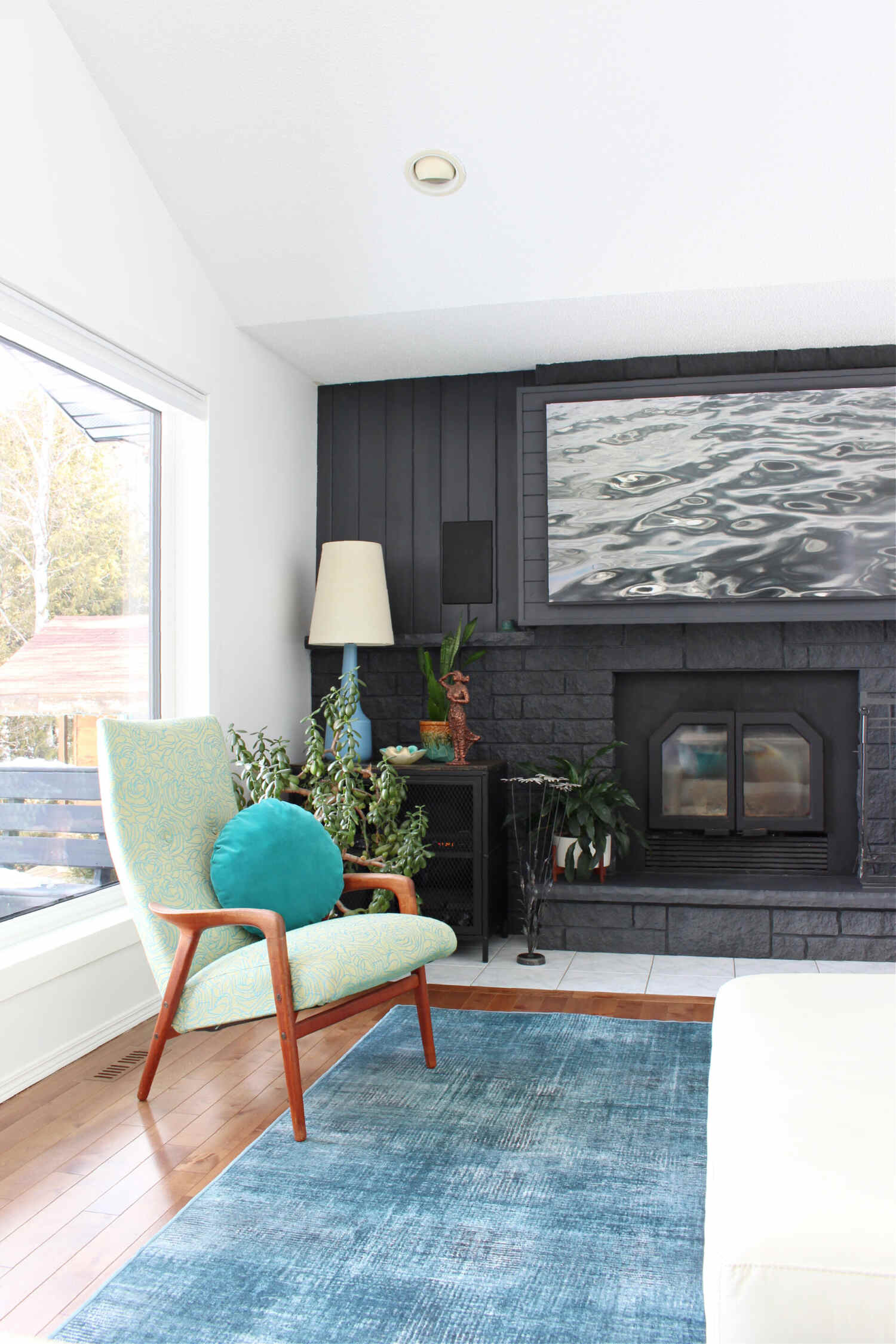 I have tried my best, but I just cannot capture the richness and intensity – or even the accurate colour – of the velvet in photos. (UPDATE 2022: I have updated this post with new and better photos). I love the shade of teal velvet so much – it will really pop against the crisp white walls and the soon-to-be charcoal grey fireplace (we successfully convinced Hubby to paint it!).