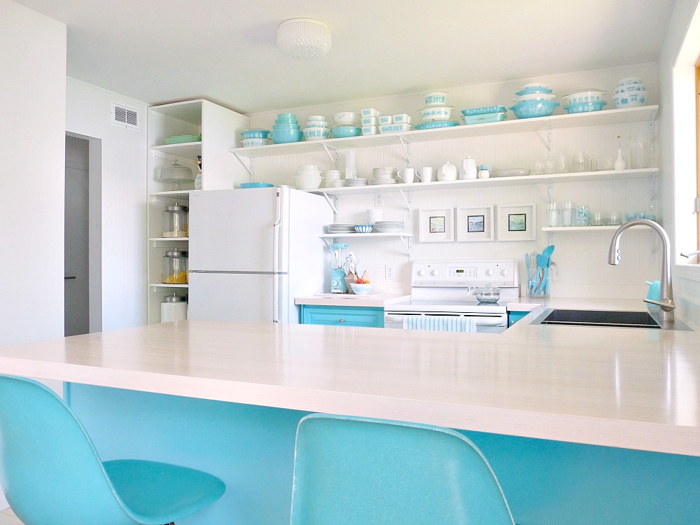 The kitchen is absolutely gorgeous! The white and the aqua are such an amazing pair! The Pyrex is such an amazing touch on those shelves.