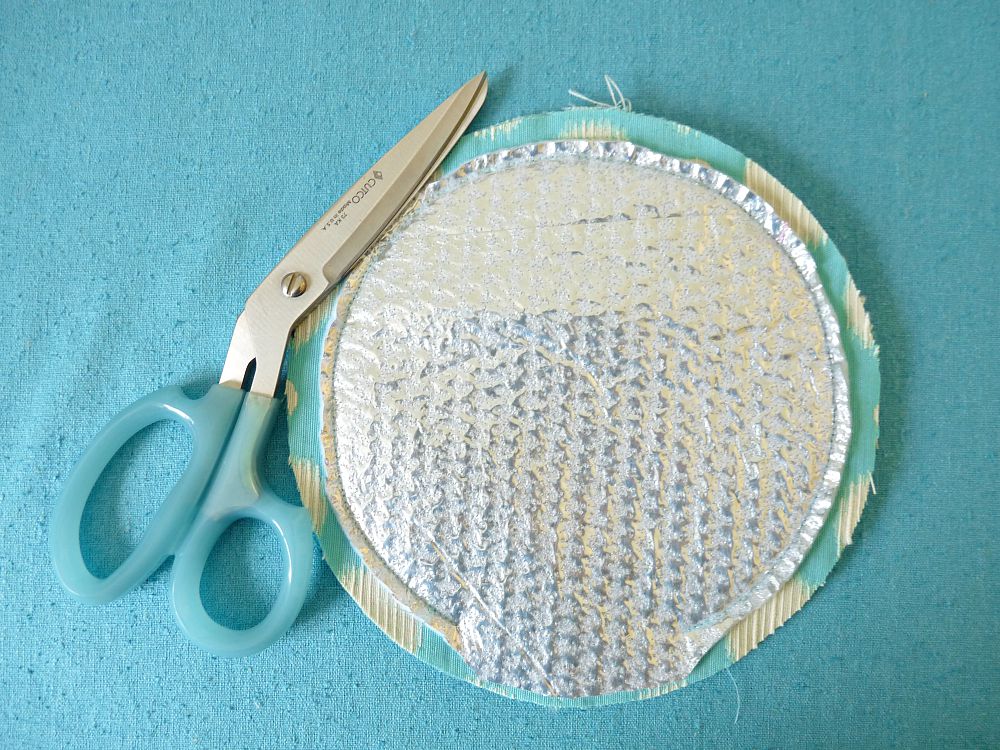 We pinned our template onto the fabric and cut out three pieces: two circles from the polka dot fabric, and one circle from the heat shield fabric.