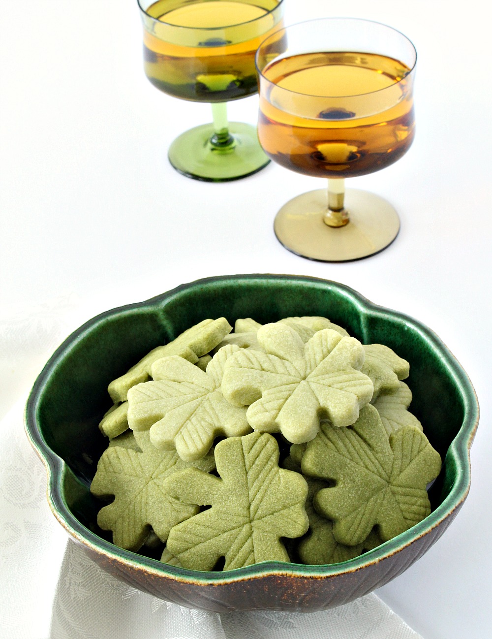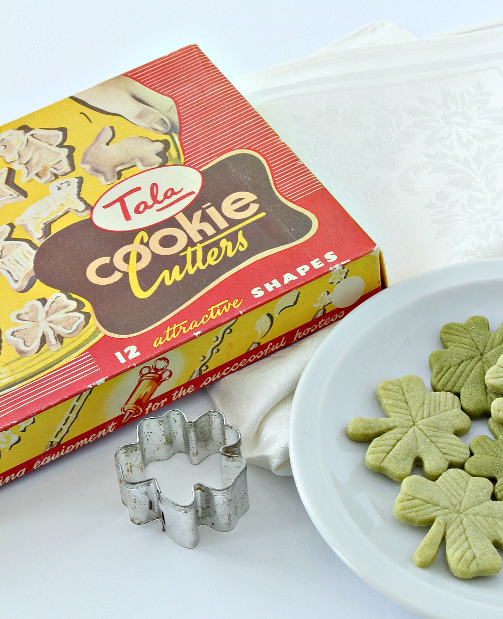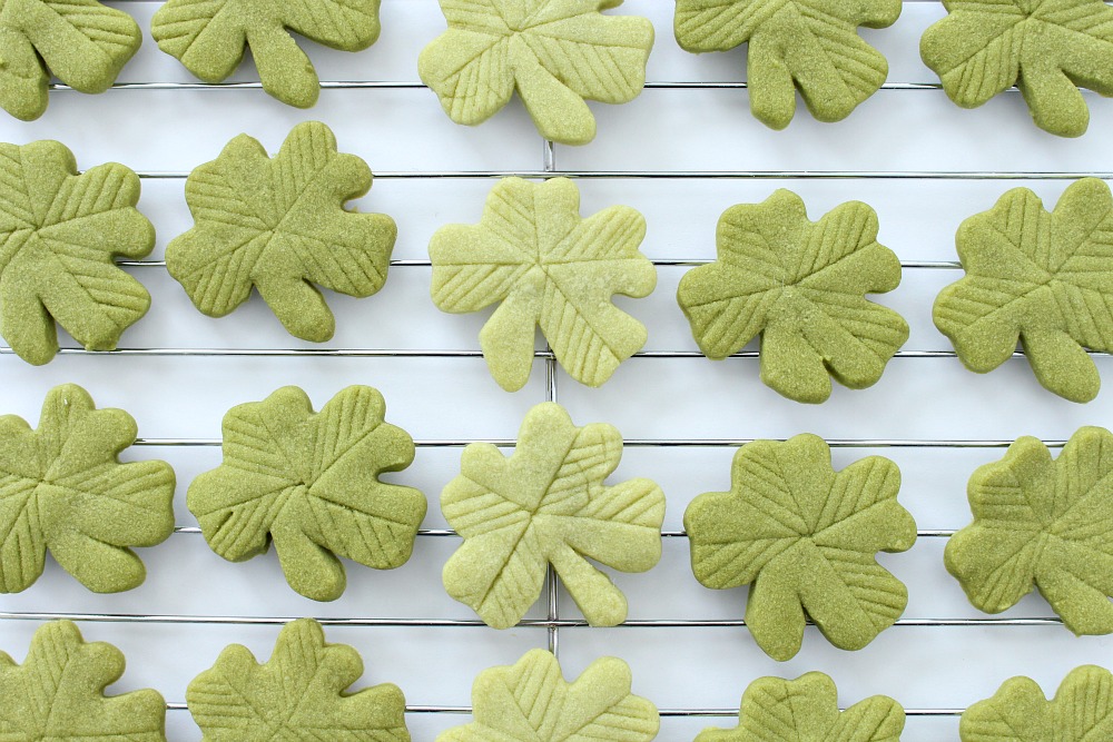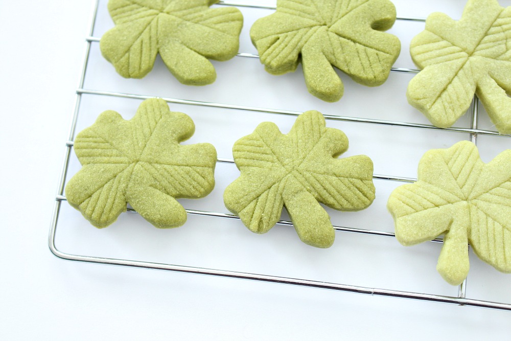 To make a leaf shape for these matcha tea shortbread cookies, the trickiest part is tracking down a four leaf clover cookie cutter. I found one in a vintage set of cookie cutters, but you can easily buy them from Amazon. This four leaf clover shaped cookie cutter looks a lot like mine (good price, too).