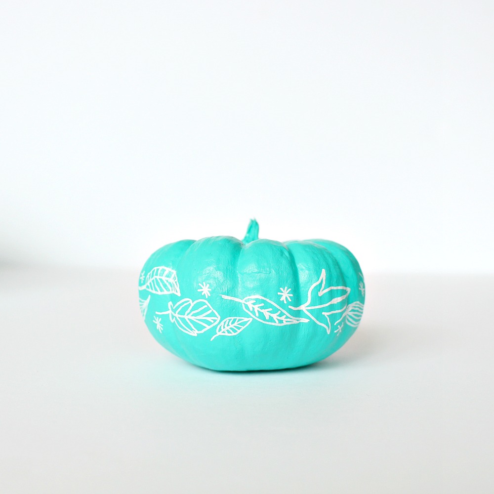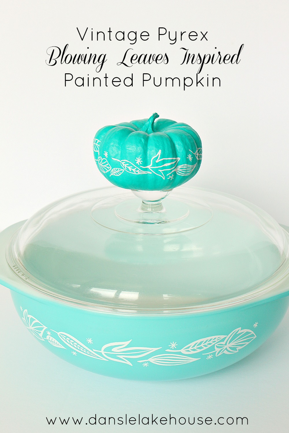 After painting a series of pumpkins turquoise for my easy turquoise rhinestone pumpkins, I started dreaming about a Pyrex-inspired painted pumpkin.  I eyed up my turquoise Pyrex collection and plucked the Blowing Leaves casserole from the top shelf.   The how-to is really simple, but it takes a steady hand.