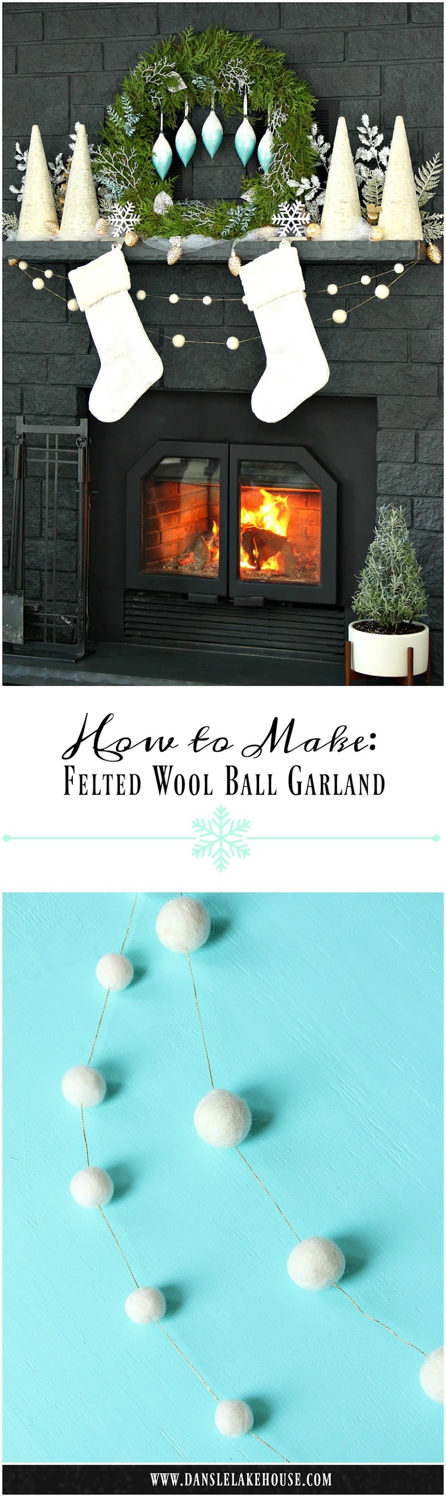 I also whipped up that cute white, DIY felt ball garland at the last minute.  I love how it really popped against my dark grey fireplace and, because the felted balls looks like snowballs, complemented my wintry theme so perfectly: