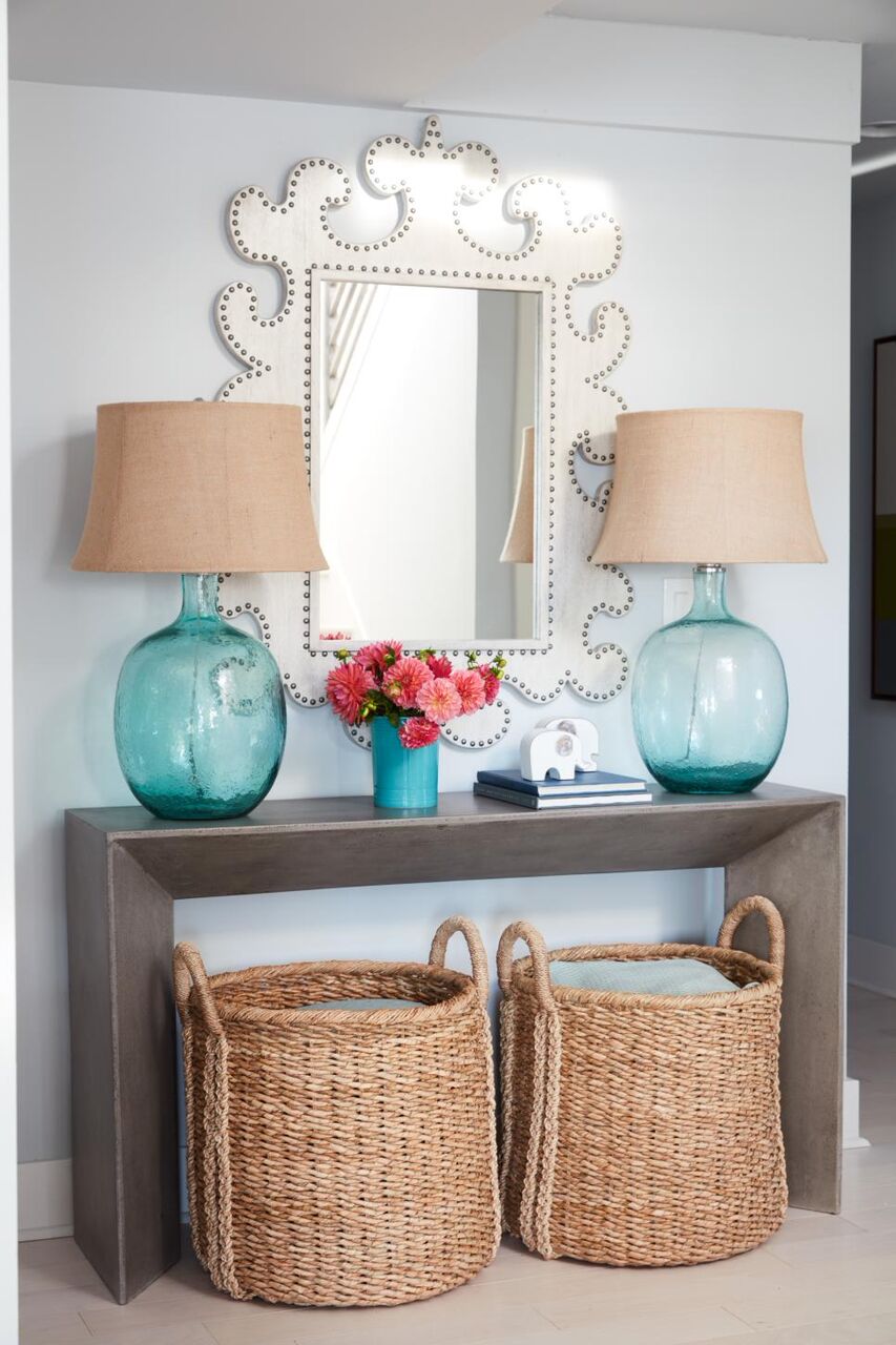I like how the decor incorporates subtle coastal touches. There’s nary a red + navy, nautical print to be found in the open concept kitchen/living/dining but many of the textures lend a beachy vibe to the space, like the beautiful rug in the living room and the baskets hung on the wall for clever storage. The driftwood end table and soft blue hues play up the coastal location a little more, but the overall look is still soft and modern.