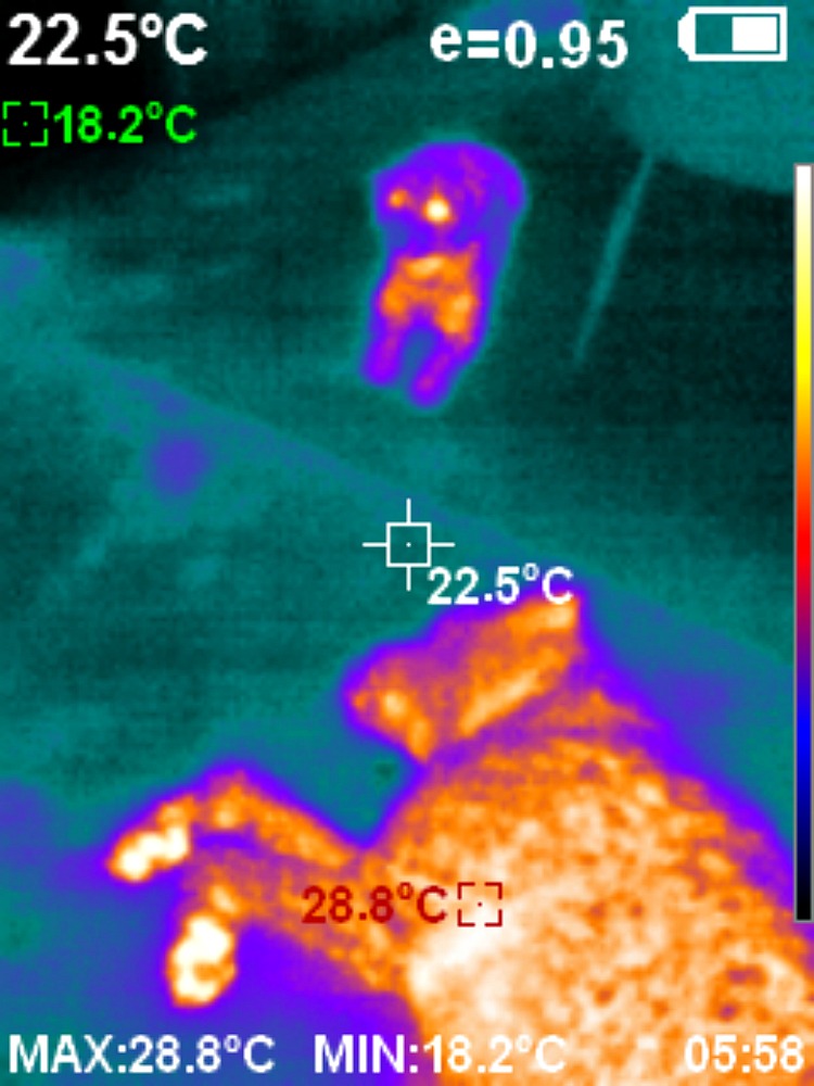 And of course we’ve been playing with it to see where their hot spots are, haha (spoiler: crotch). But in all seriousness, examining the dogs with this IR camera could isolate injuries and detect disease because an unusual hot spot could indicate a health abnormality. So by examining the dogs for fun, we might one day spot a health concern to bring up with our vet – and we all know that with health issues the earlier a problem is caught, the better! Just keep in mind that this isn’t a true medical device and there are limitations to it.
