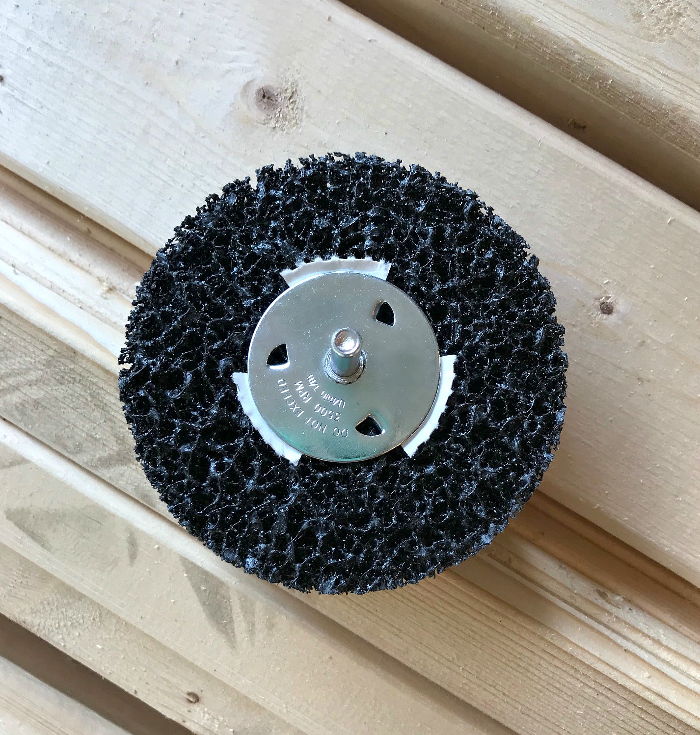 I worked on the boat in stages, tackling the outside first, and then flipping it over to work on the inside. First I gave the exterior a really good scrub, beginning with a sanding pad I could attach to my drill – I found it in the automotive section and it’s designed to sand paint from vehicles: