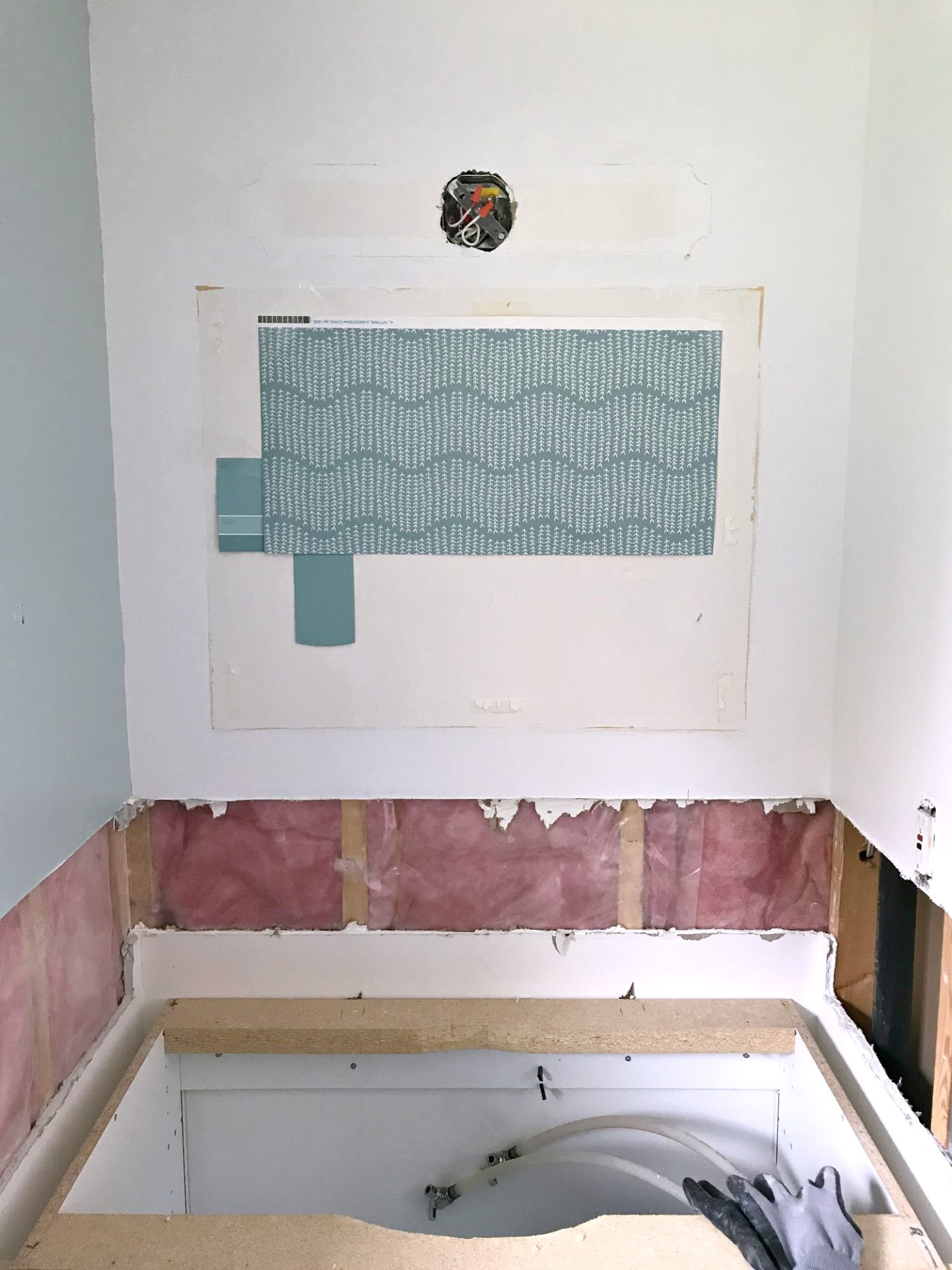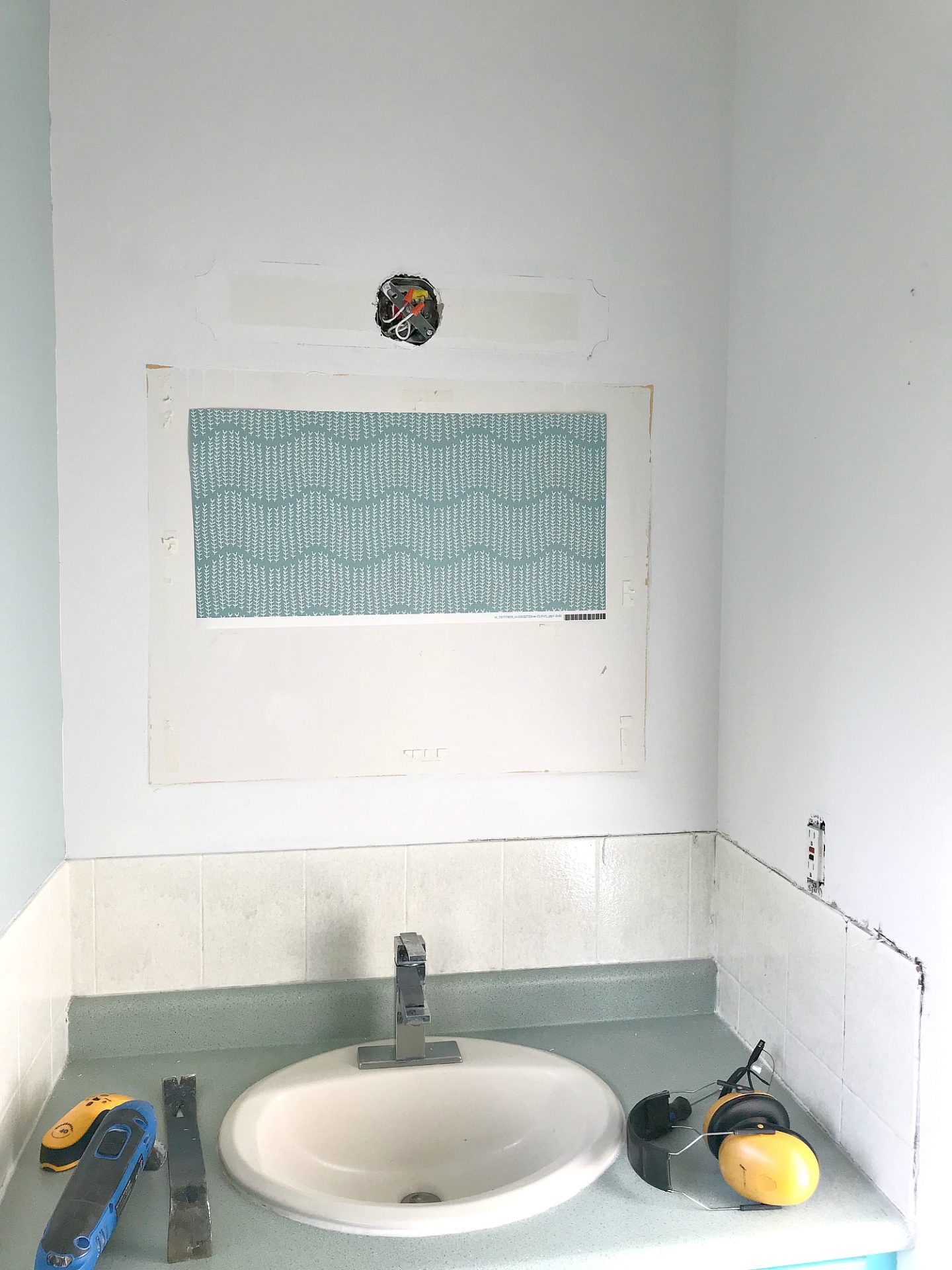 This beautiful wallpaper is one of the biggest design elements in the room, so having that installed now really makes a big impact. Let me catch you up quickly! We removed the old tile, counter, sink and faucet.
