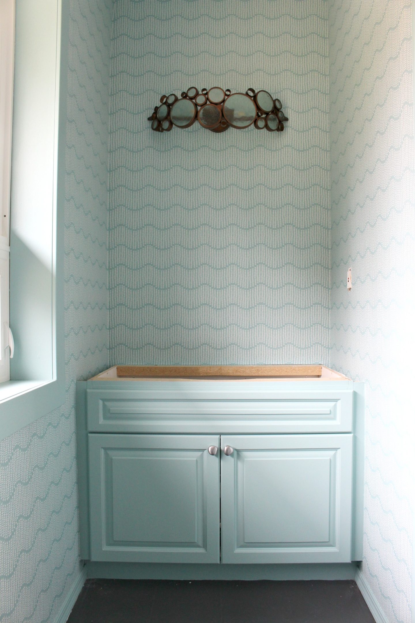 For the trim and vanity paint, I waffled between white and matching the paint to the wallpaper – and ultimately decided to match the soft turquoise. A powder room is supposed to be a little jewel, right? A place to go wild with color and pattern? The background color of the wallpaper is a near perfect match to Behr’s Lap Pool Blue – my new favorite color. It’s a soft aqua with lots of green and a quietness – it’s not a bright nursery mint or aqua, it’s more refined and pulled from nature.