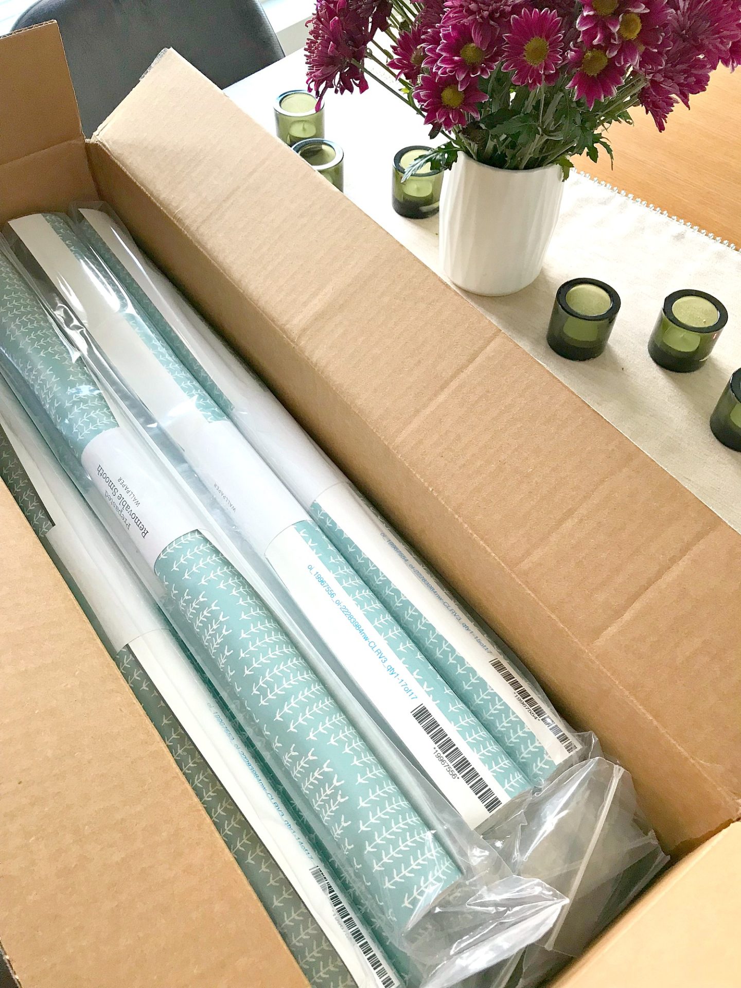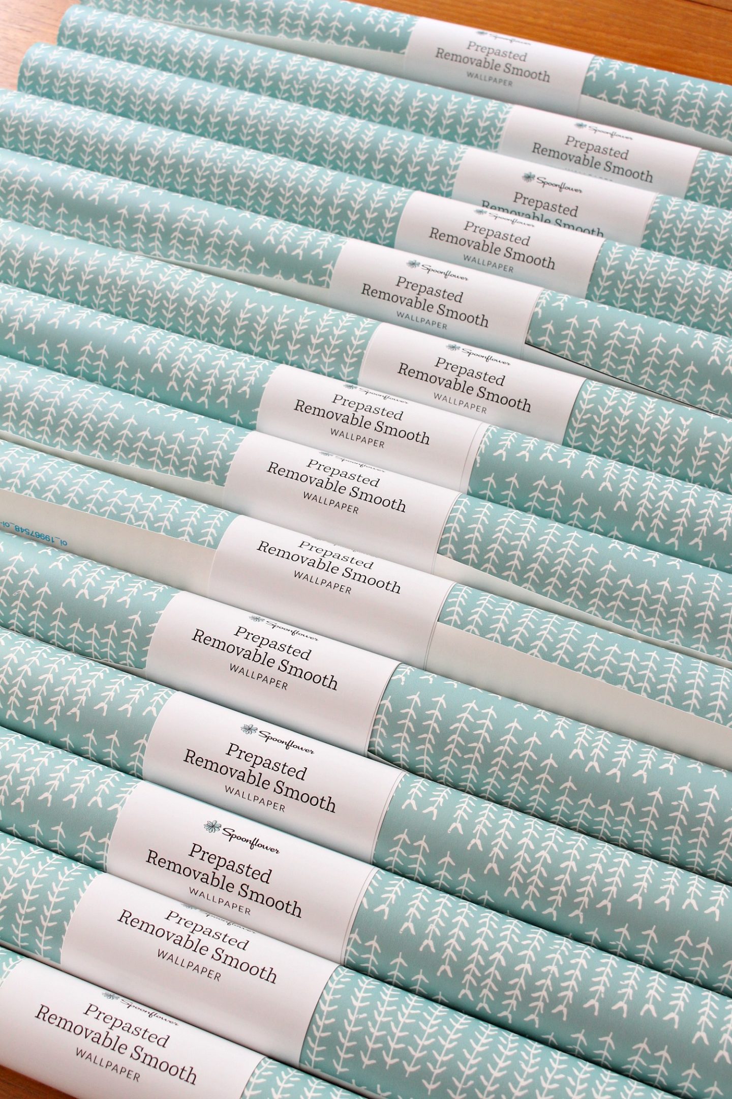 Although I’ve shared mini updates in Instagram stories, I skipped the last two One Room Challenge blog updates. Playing by the rules has never been my strength. But honestly, I figured it would be super boring for you to see what was happening around here: me, sitting at the end of the driveway waiting for delivery trucks, haha. I’m kidding, sorta, but I took the 6 week challenge a liiitttttle too literally and was ordering things and finalizing decisions well within the 6-week time frame! And well past the point that other ORC guest participants were actually working. I did make important progress though, tearin’ stuff up, but that kind of work is boring to watch without a reveal. Well, that’s my opinion anyway. I think that’s why I don’t watch design shows. They spend 55 minutes on the demo, reno and manufactured drama (oh no, foundation problems and we need to increase the budget!), and then 5 minutes on the reveal. But today – finally! – I have a super juicy update to share (with a hint of a reveal and a little demo – in case you like those rough around the edge photos)! The Spoonflower wallpaper arrived and my Mom and I installed it in two days! I ended up choosing Sprigs on Ocean, in a smooth removable wallpaper. It was so exciting to open up the box and see rolls and rolls of it – the sample size was really generous, but I was looking forward to seeing it on a bigger scale.