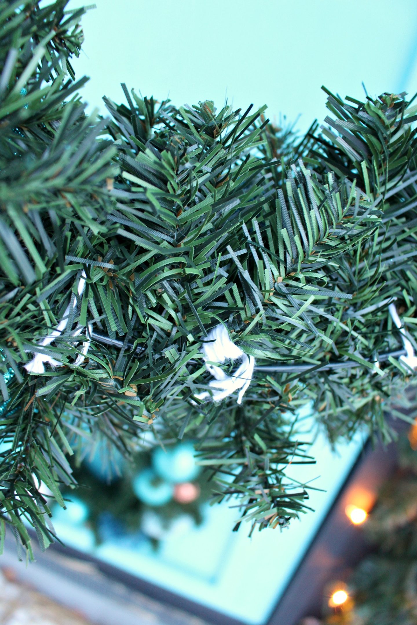 First I made an assortment of pom poms using my tutorial. I made them in my signatures teals and aqua – but I also secretly made some red, which I jettisoned at the last minute (I just don’t like red, but I tried, lol). It’s super easy – and kind of relaxing! – to make DIY pom poms, so making an all-pom pom wreath wouldn’t be difficult. Just one tip after you read my pom pom tutorial: for the final step, winding some yarn/string around the pom pom maker (see photo below), I used a super tough cotton yarn for this set of pom poms, so they would hold up outside. That final step is what holds all of the yarn together, so you want to use something that won’t tear or break: