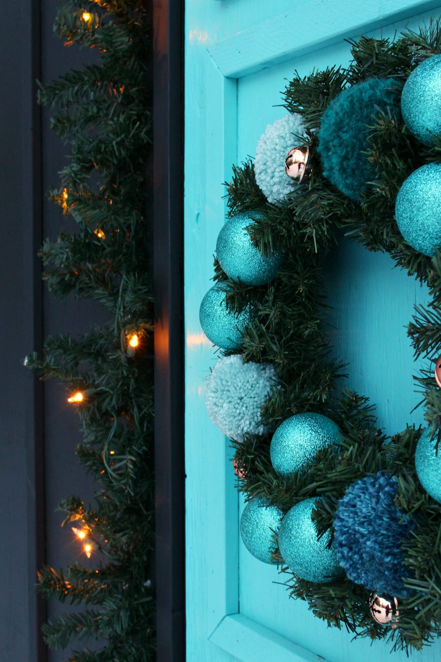 I originally planned an all-pom pom wreath but then I found the evergreen wreaths on sale for only $5. So I planned an all-pom pom and evergreen wreath, but as I played with the placement I decided that it looked more interesting and festive if I added some glittery ornaments and some coppery bells. I also wasn’t sure if a 100% yarn wreath would end up a soggy mess outside (so far, the yarn looks perfect, so that might have been an unfounded worry).