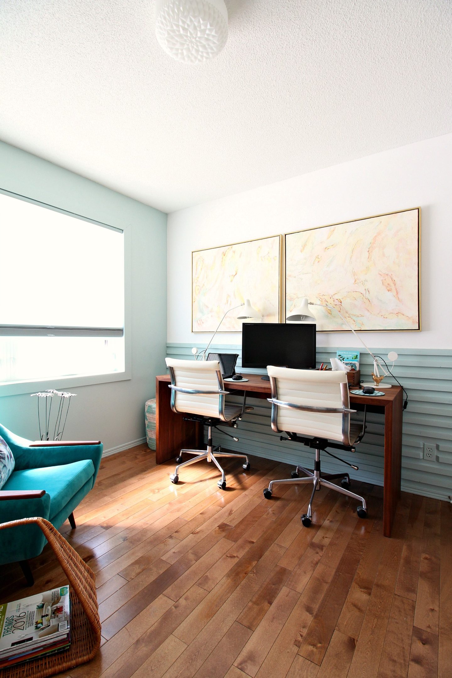 What do you think of my new DIY horizontal slat wall, painted the same color as my office accent wall? I like how the DIY walnut desk we made pops more against the soft grey/green and the soft, pastel abstract paintings (a wedding present from Hubby’s grandpa) are framed out in a way that make them “pop” a bit more. I am LOVING the finished product but, if I ever change my mind, the slats are just air nailed into place and easy to remove – the walls will just need some patch and paint, but will be good to go.