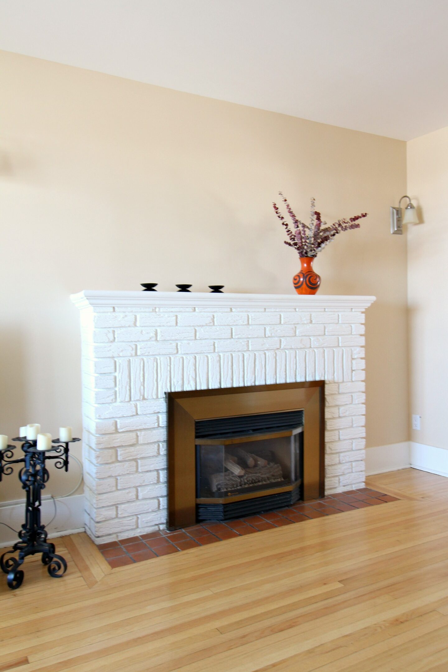 For any remaining areas, I used a small artist’s brush to get paint into the deepest crevices of the brick and around the gas fireplace insert.