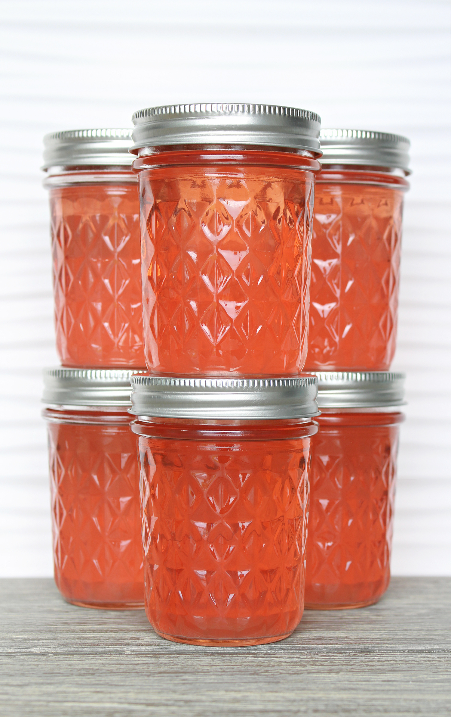 Approximately 7 eight ounce half pint jars. Sometimes I had a touch leftover, so I kept an 8th clean jar on hand and then used up the extra that day. You can reduce the sugar if you’d prefer – but only if you don’t plan to can it.